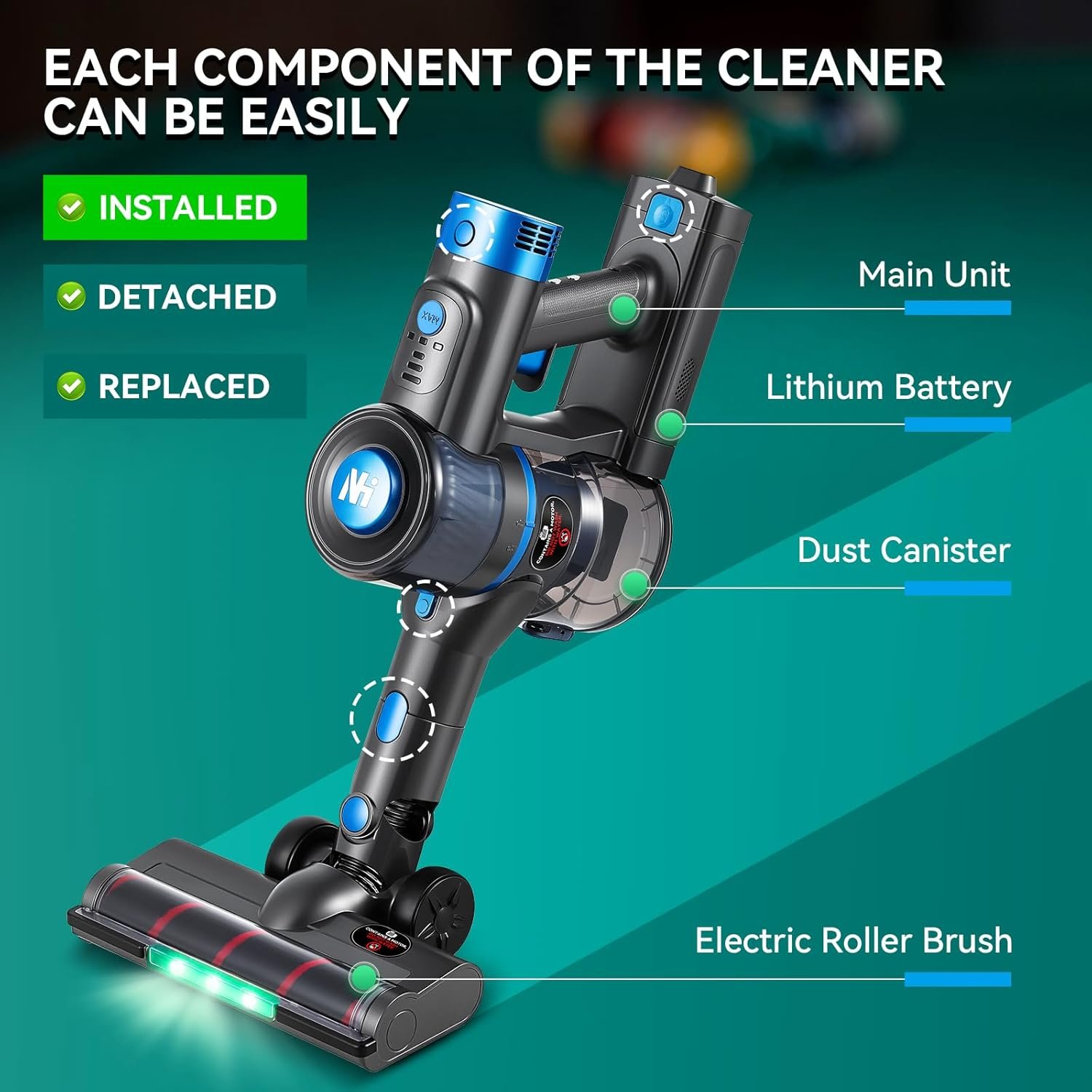 【Powerful Suction with Quiet Operation】Powered by a carbon brush motor, this cleaner delivers strong suction with low noise levels. With 2 adjustable suction modes, it effortlessly maintains your pool table cloth, keeping your table in top-notch condition.