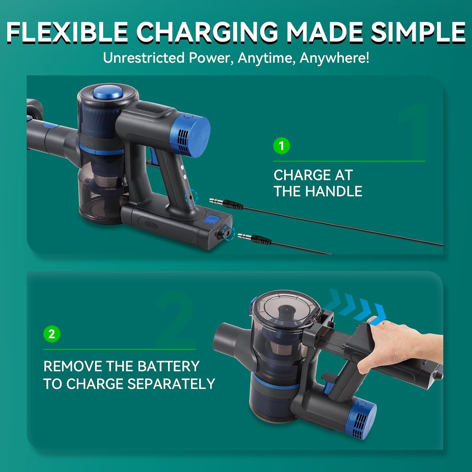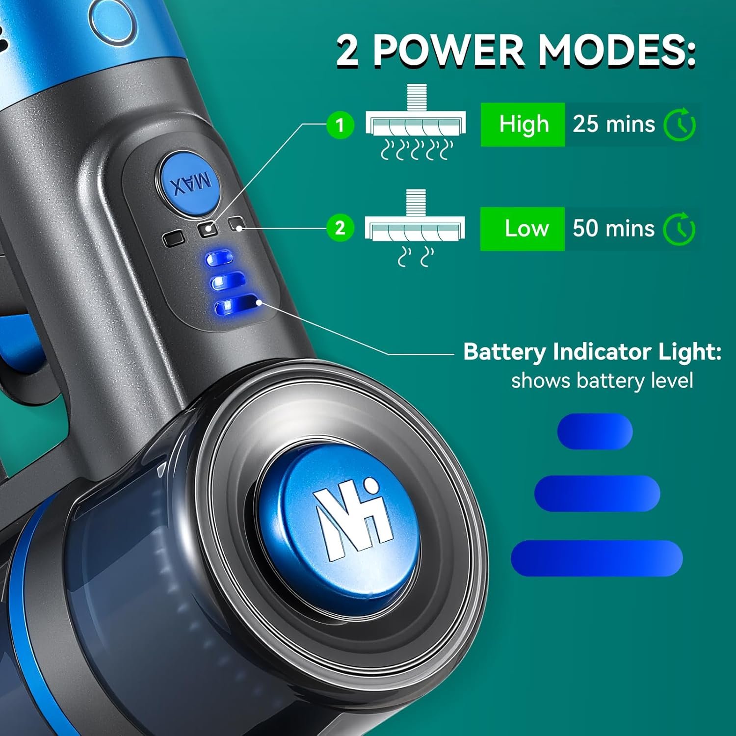 【Portable Lithium Battery】Equipped with a detachable lithium battery, the vacuum cleaner allows for easy charging and replacement. Offers up to 50 minutes on low power and 25 minutes on high power.