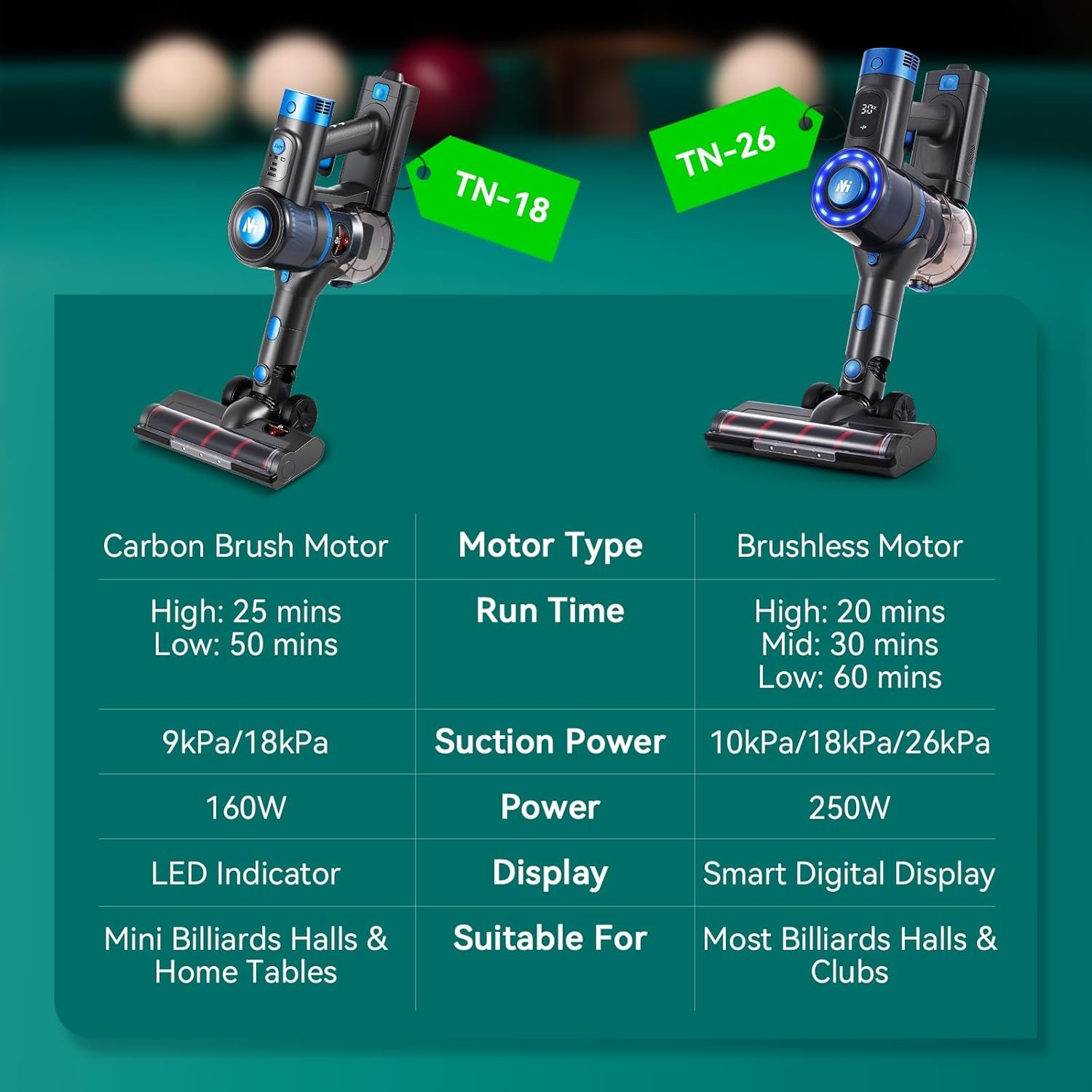 【TN-18 Billiard Table Cloth Cleaner】Model: TN-18 | Power: 160W | Suction Power: 9kPa/18kPa | Designed with a gentler suction compared to the TN-26 model, it’s more suitable for daily cleaning of small pool halls or home pool tables. It effectively clears away dust while keeping your table cloth in pristine condition for longer.