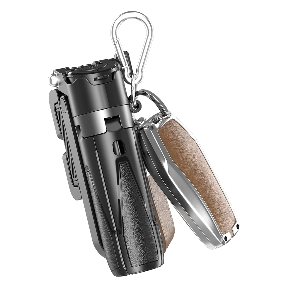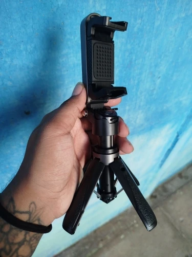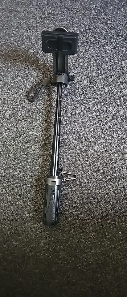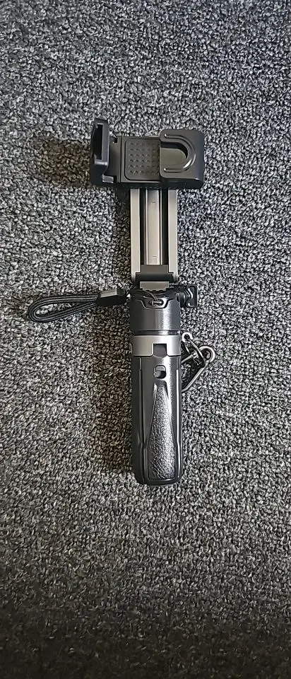 The tripod is excellent, delivery was slightly delayed, the set includes two carabiners, one with a loop and one metal, quality is excellent, matches the description, holds the phone securely, when extended I would add 20 cm but overall everything is clear, I recommend the seller, worth the money.