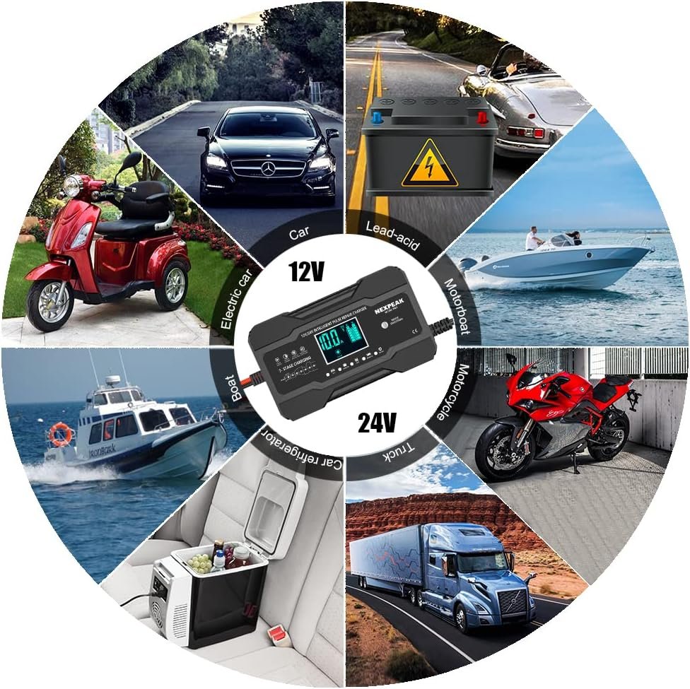 NEXPEAK 10-Amp Car Battery Charger, 12V and 24V Smart Fully Automatic Battery Trickle Charger Maintainer w/Temp Compensation for Truck Motorcycle Lawn Mower Boat Marine Lead Acid Batteries