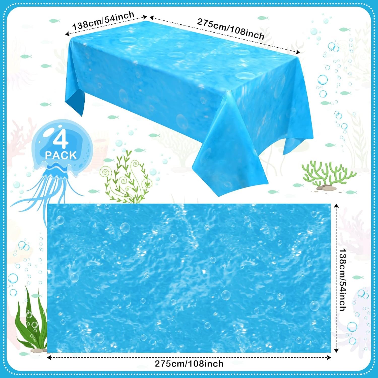Satisfy Your Use Demand: the package comes with 4 pieces of ocean theme tablecloths in total, and they are all in blue appearances, sufficient quantities can meet your decoration needs easily for your ocean themed party