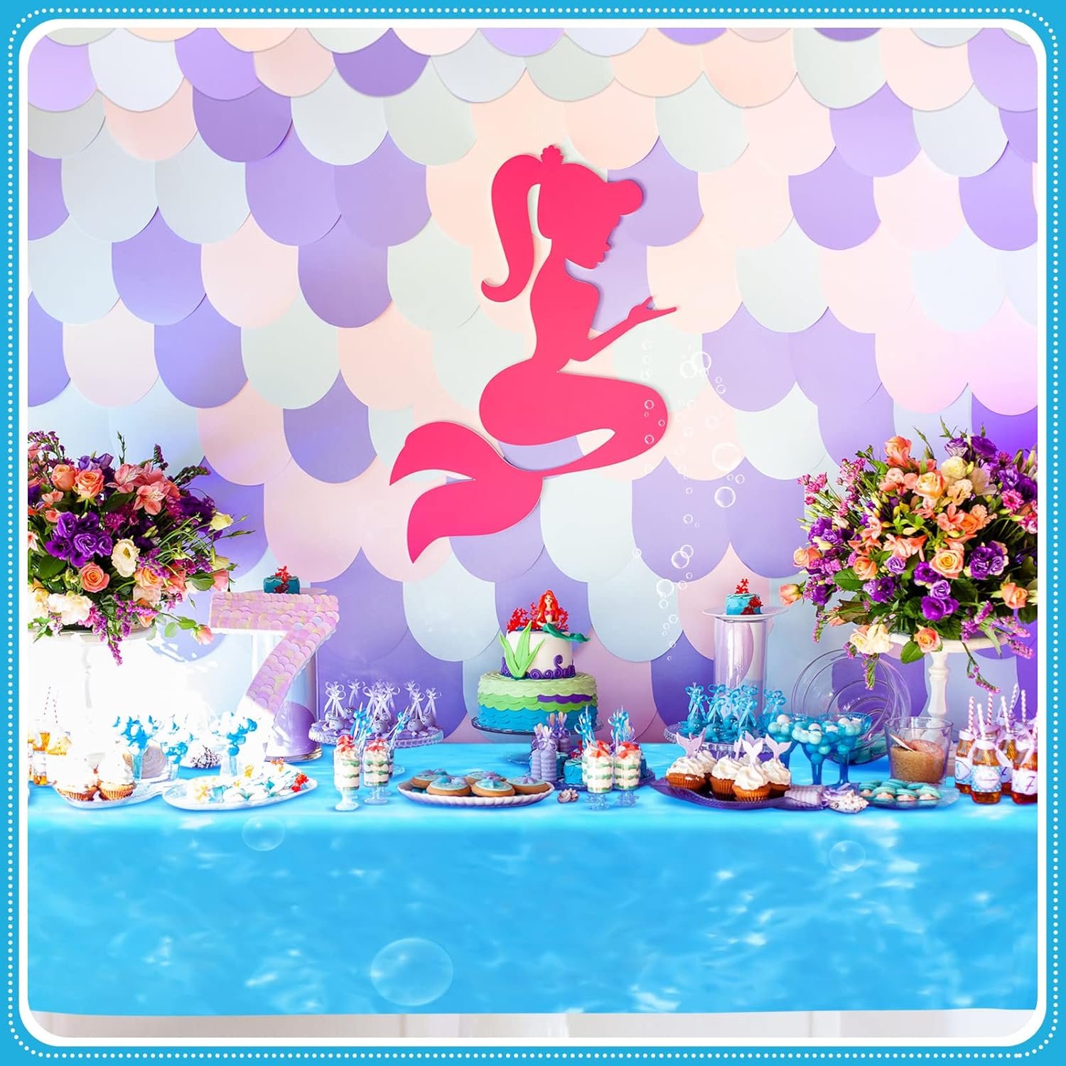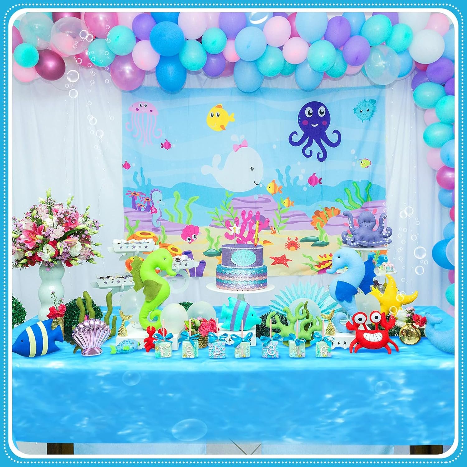 Ocean Birthday Party Supplies: these sea theme table cloths are designed with many patterns of bubbles, adorable and fun, the watercolor style can easily create a dynamic birthday party atmosphere