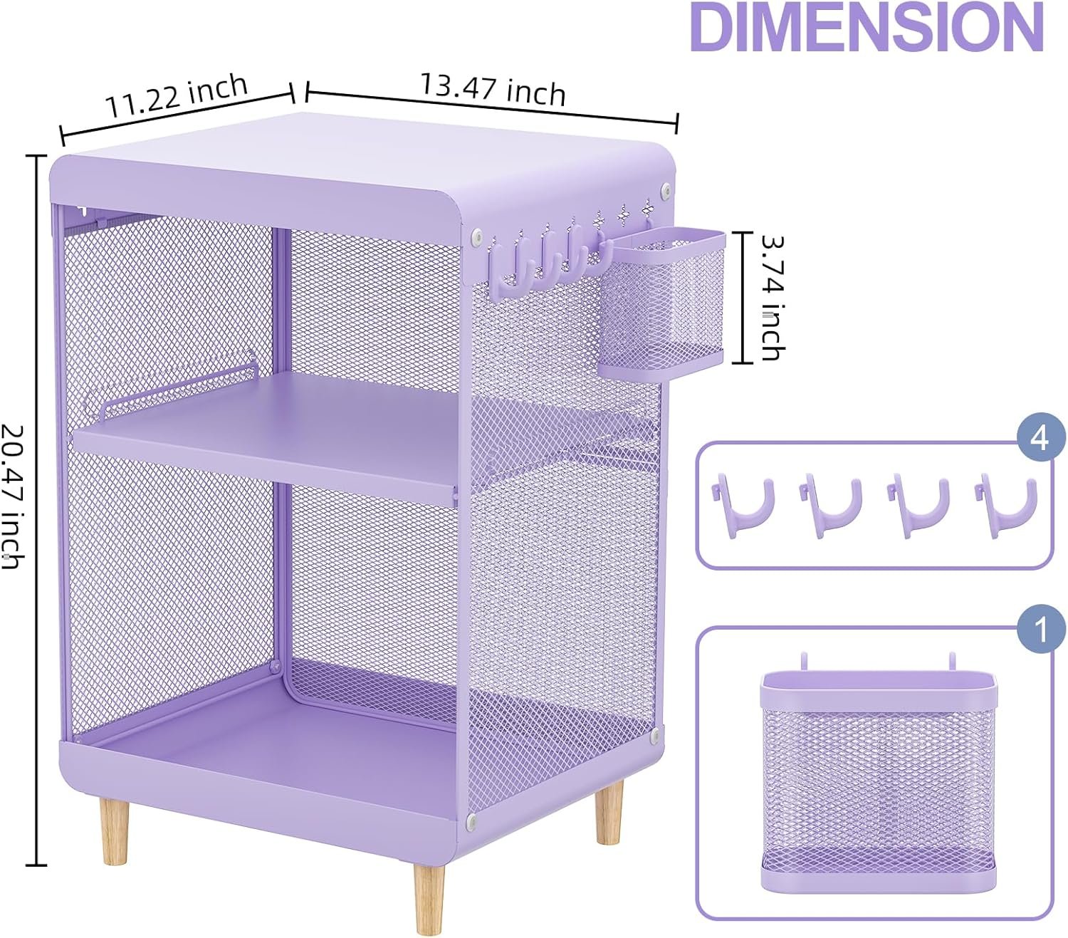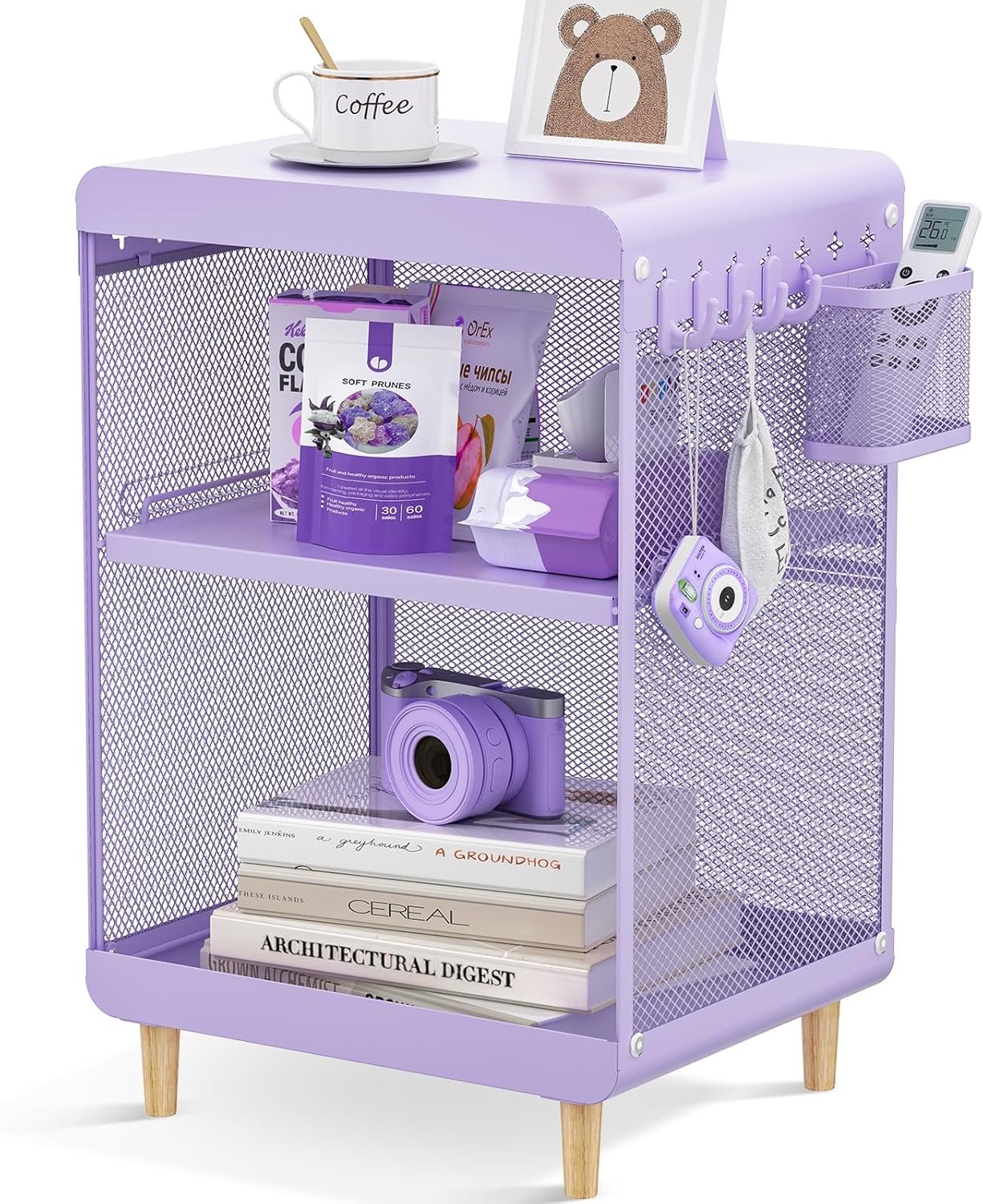 VERSATILE DESIGN – The 3-tier metal side table is cleverly designed with hanging holes on both sides, and provides 4 hooks and a small hanging basket for you to store remote control, keys and other small items. It is Compact and practical.
