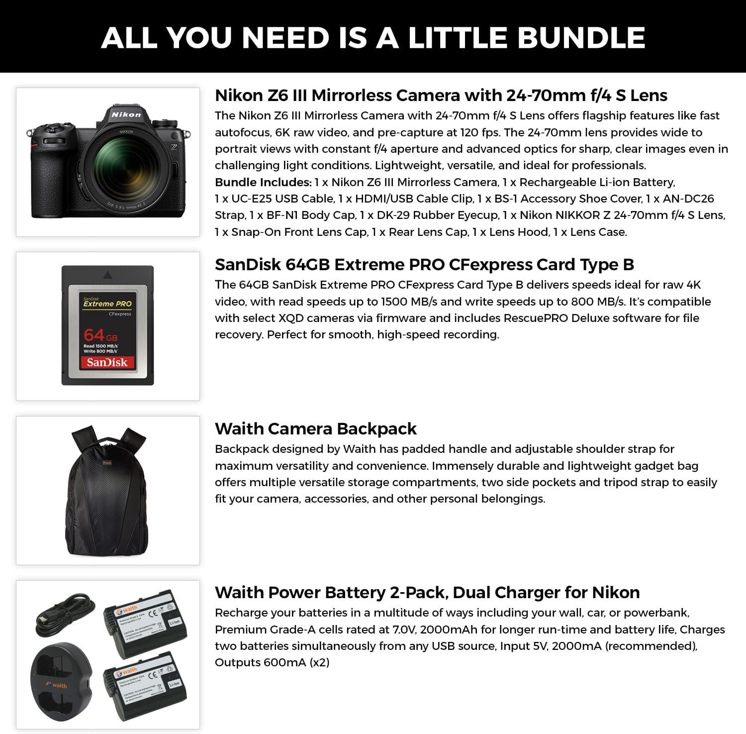 Bundle Includes: 1 x Nikon Z6 III Mirrorless Camera, 1 x Rechargeable Li-ion Battery, 1 x UC-E25 USB Cable, 1 x HDMI/USB Cable Clip, 1 x BS-1 Accessory Shoe Cover, 1 x AN-DC26 Strap, 1 x BF-N1 Body Cap, 1 x DK-29 Rubber Eyecup, 1 x Nikon NIKKOR Z 24-70mm f/4 S Lens, 1 x Snap-On Front Lens Cap, 1 x Rear Lens Cap, 1 x Lens Hood, 1 x Lens Case, 1 x SanDisk 64GB Extreme PRO CFexpress Card Type B, 1 x Waith Camera Backpack, 2 x Waith Power Battery, 1 x Waith Battery Charger