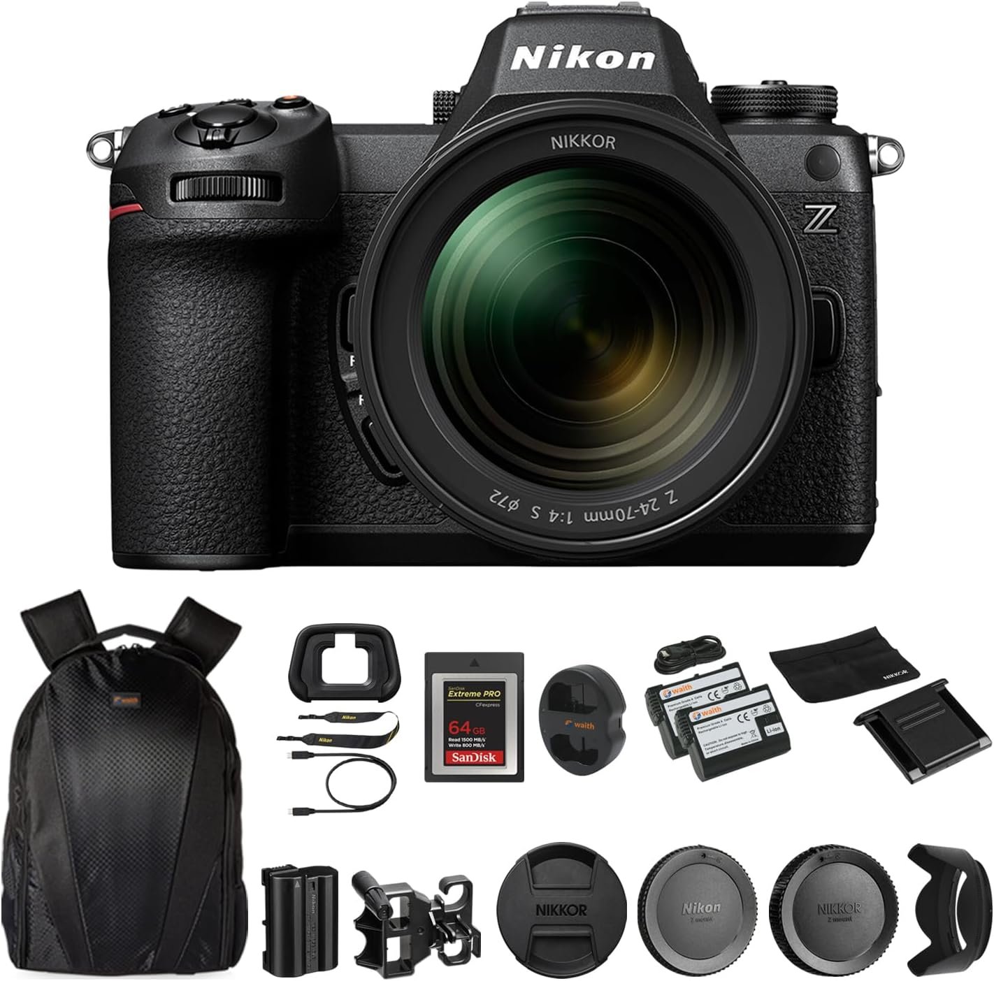 Nikon Z6 III FX-Format Mirrorless Camera and NIKKOR 24-70mm f/4 S Lens (Black) with 64GB Extreme PRO CFexpress Type B Card, Waith Battery + Charger Combo and Waith Camera Backpack (Bundle Set)