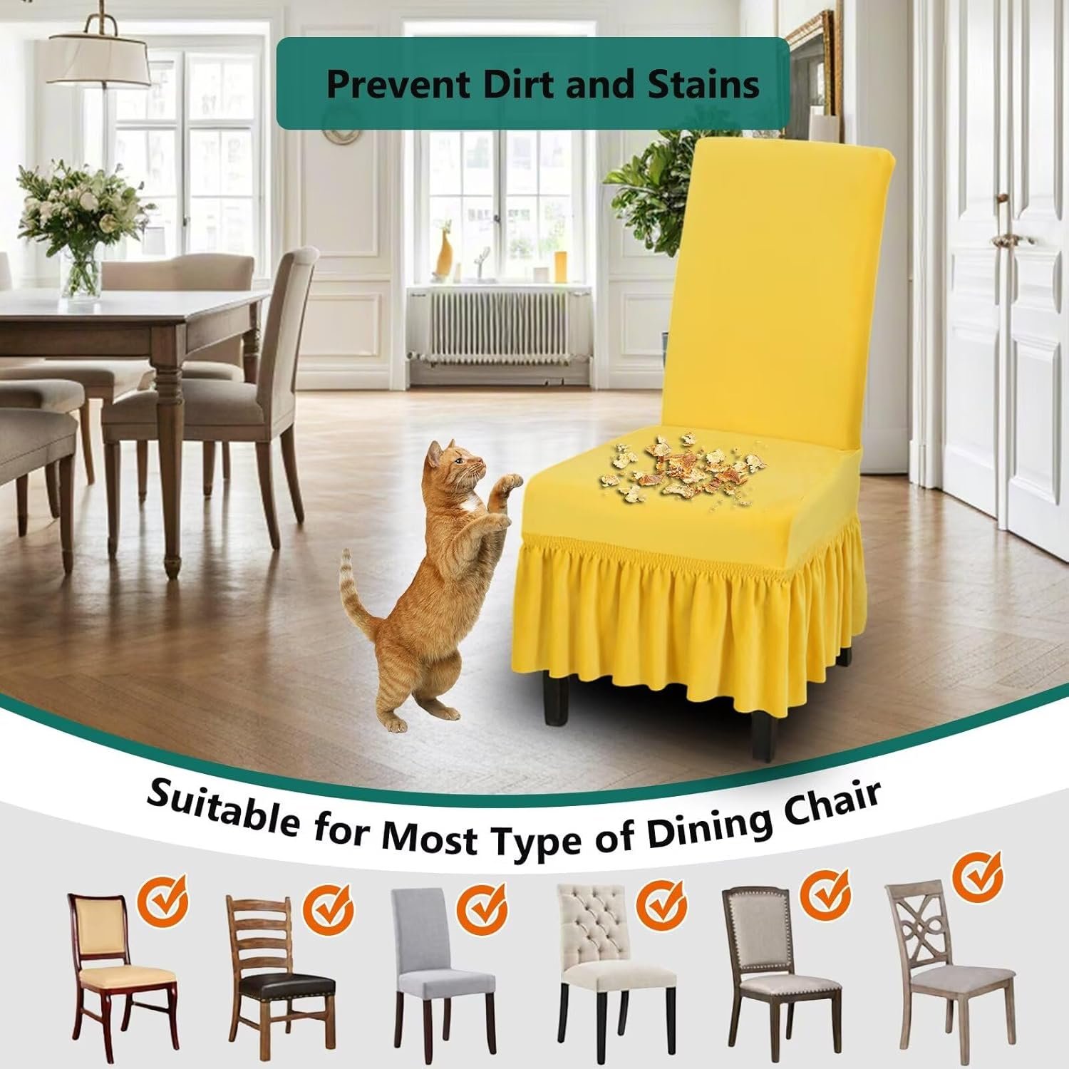 Wide Range of Applications: The chair covers for dining chairs is designed with skirt that cover the bottom edge well to provide full 360-degree protection which will not only make the chair more elegant, beautiful, but also freshen up your home decoration. Decorative chair covers can be used for living rooms, wedding banquet, hotels, meeting, celebration, ceremony, dining room. etc