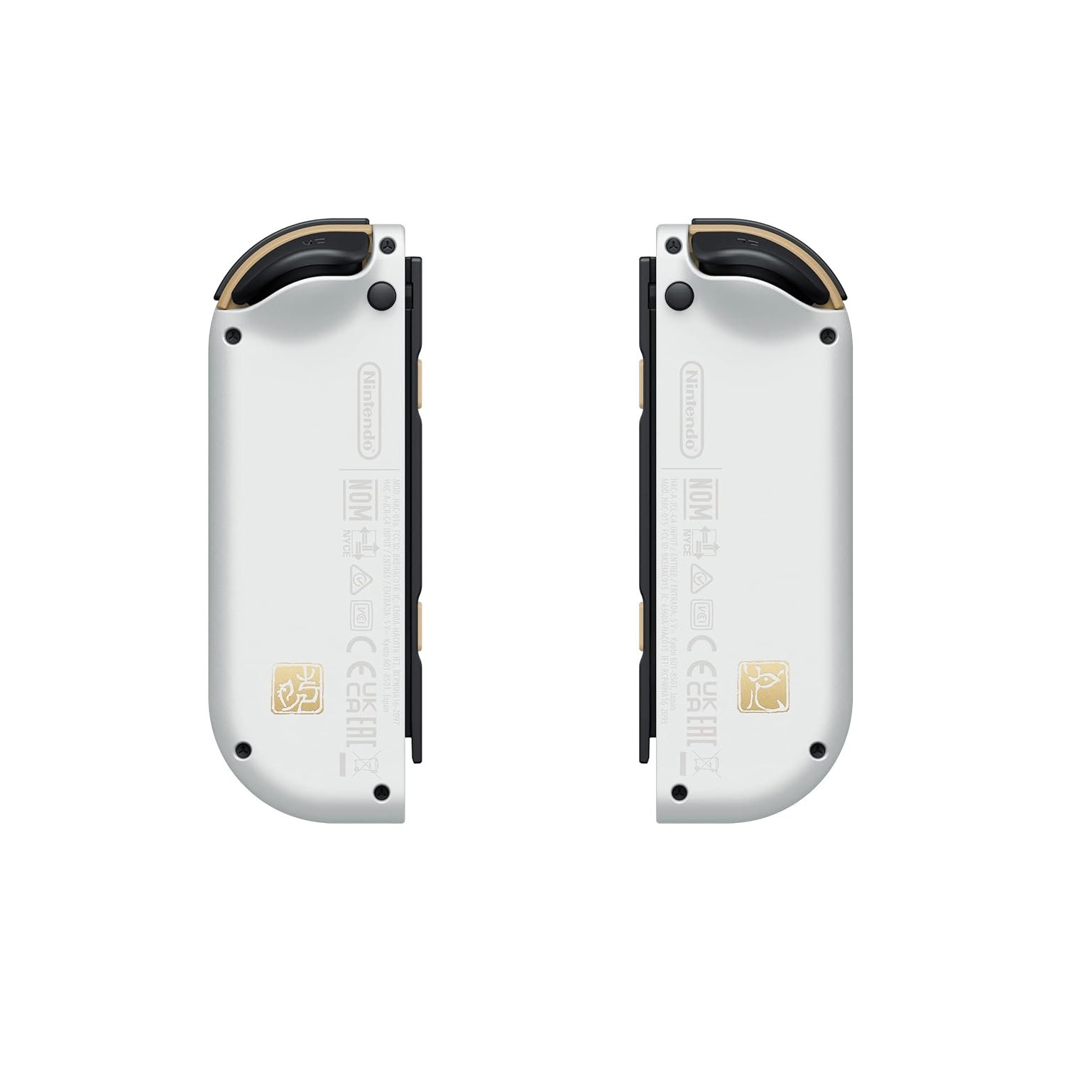 • Glossy white dock with Hylian illustrations: On the surface of the glossy white dock, symbols featured in the Legend of Zelda: Tears of the Kingdom game are displayed in gold along with the Hylian Crest