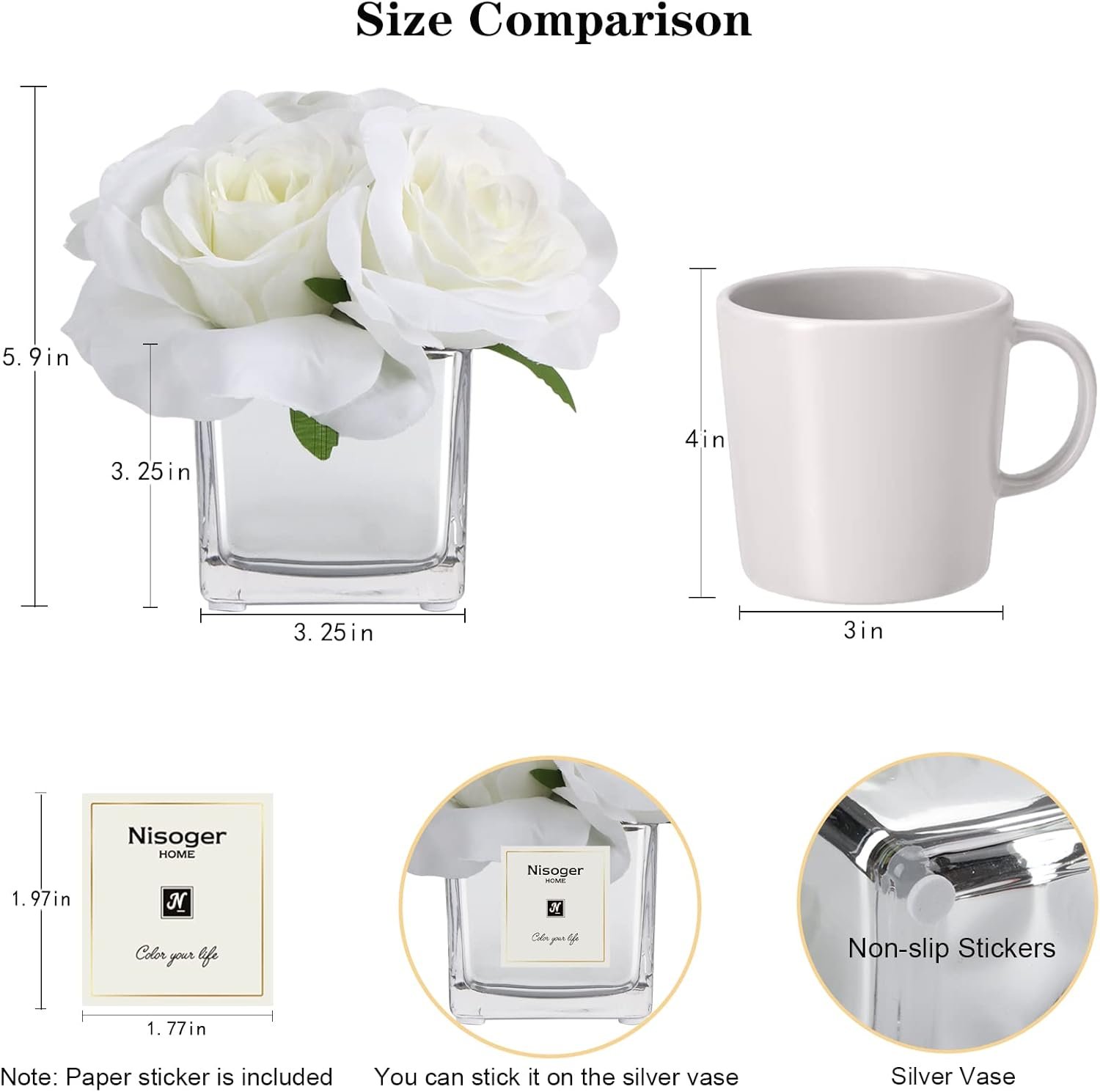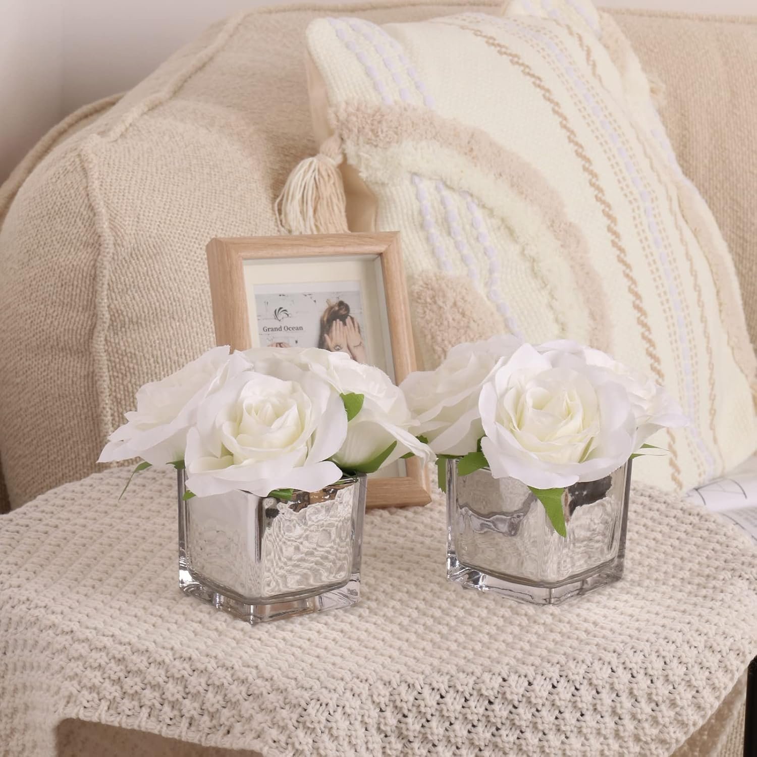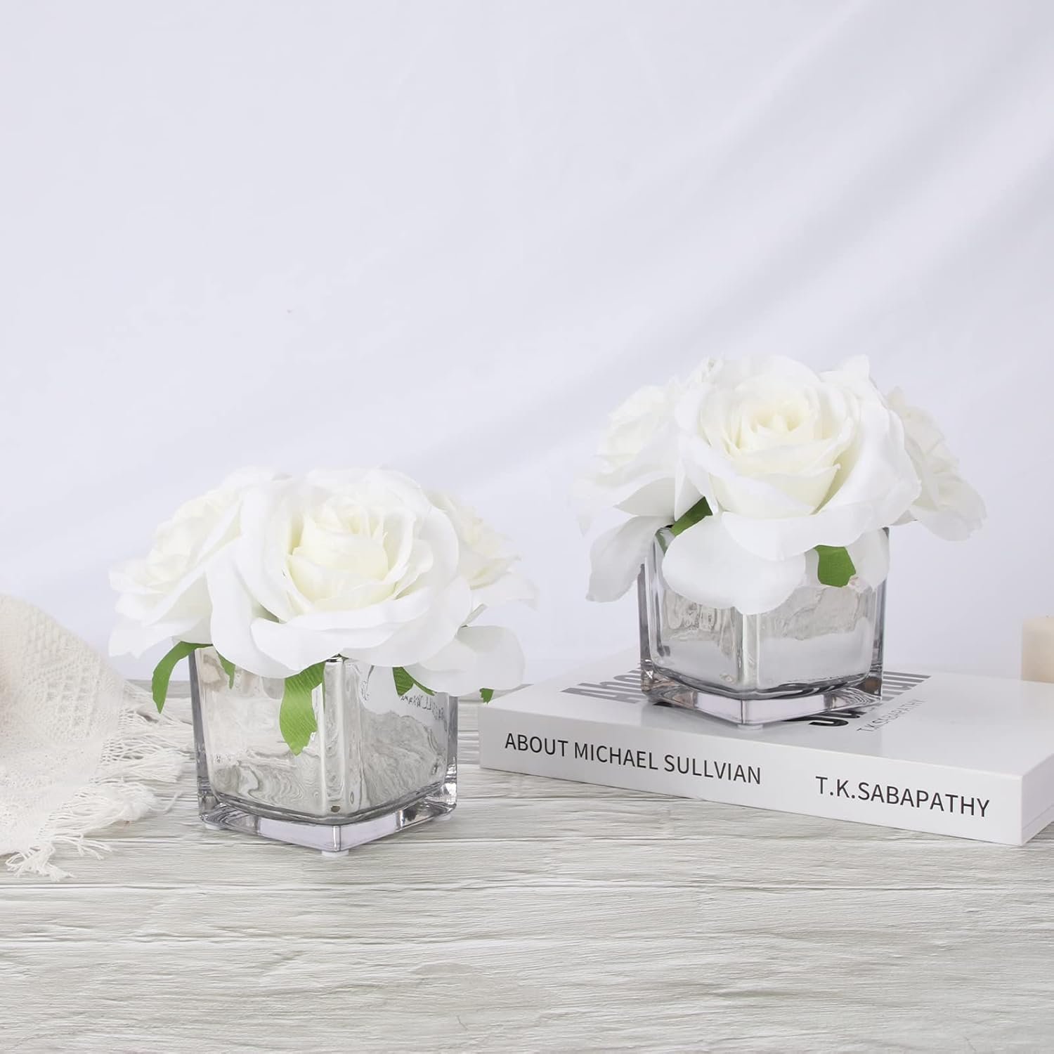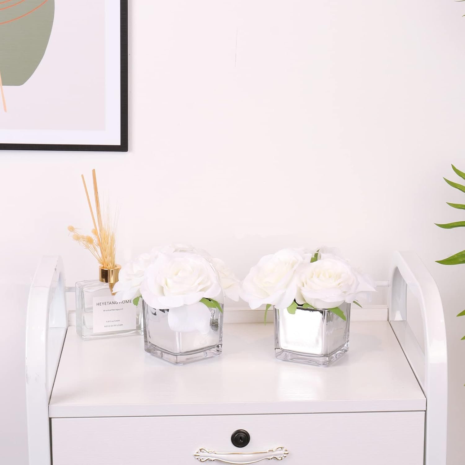 Nisoger 2 Pack Fake Flowers with Vase, Silk Roses Artificial Flowers in Vase, Faux Flower Arrangement with Vase Suitable for Home Office Decoration, Dining Table Centerpiece