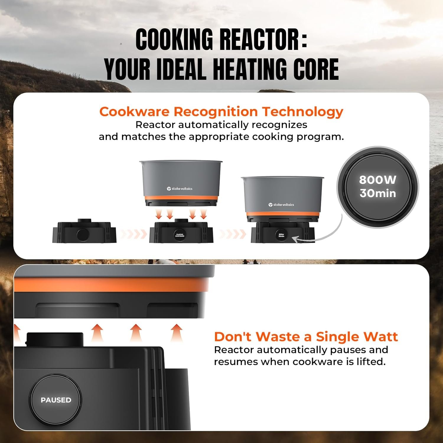 Versatile Power Source Compatibility: Nomad cooking reactor is a cookeware with five power levels from 200W to 1000W that seamlessly integrates with car inverters, fuel generators, portable power stations and RV power sources, making it the ultimate outdoor electricity cooking solution for Car Camping,RV,EV,Overlanding and Vanlife