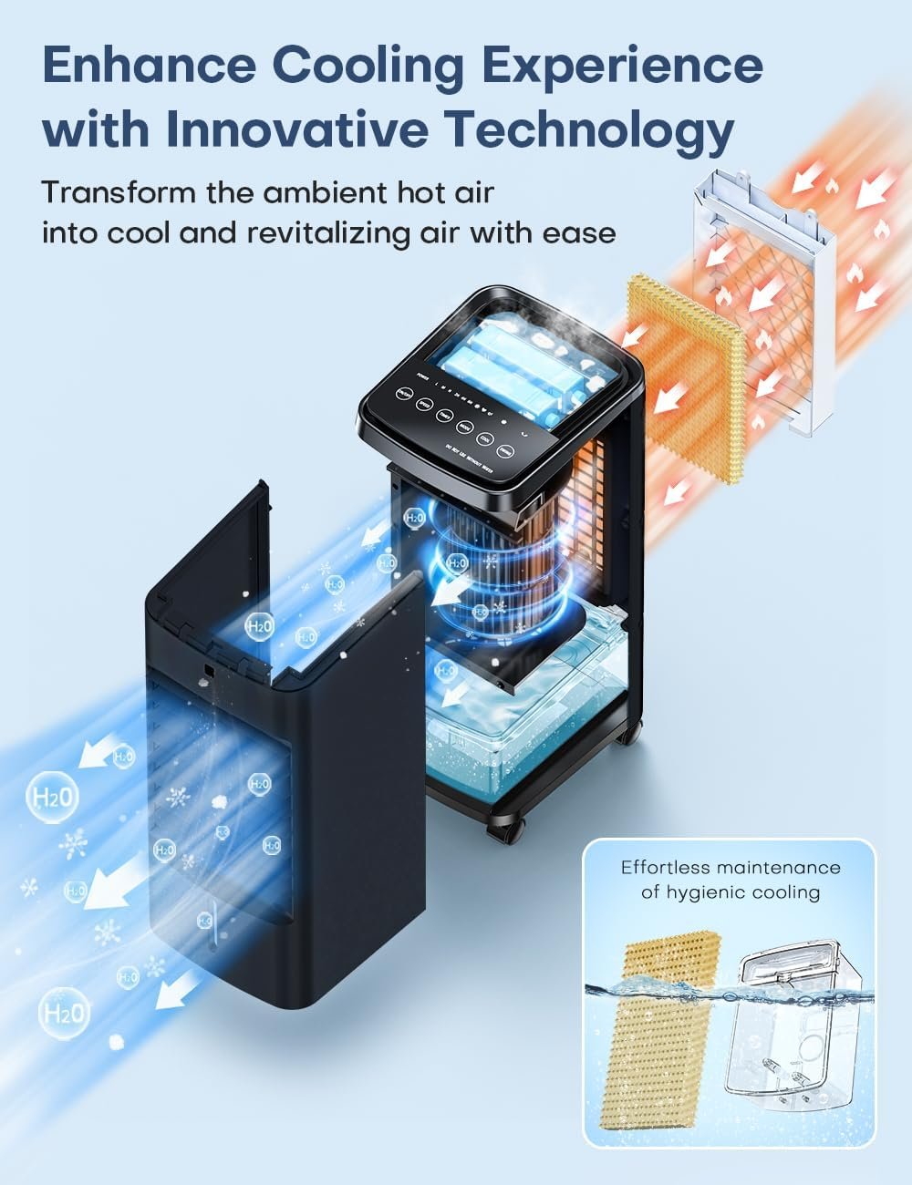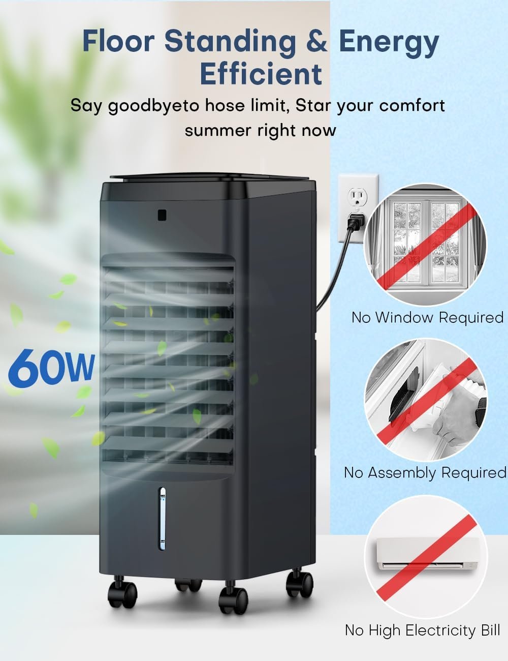 NOMEY 3-IN-1 Portable Air Conditioners 4 Modes & 3 Speeds, Waterless Alert System, 12H Timer, 1 Gal Detachable Water Tank, 4 Ice Packs, Remote, 70° Oscillation Windowless Evaporative Air Cooler