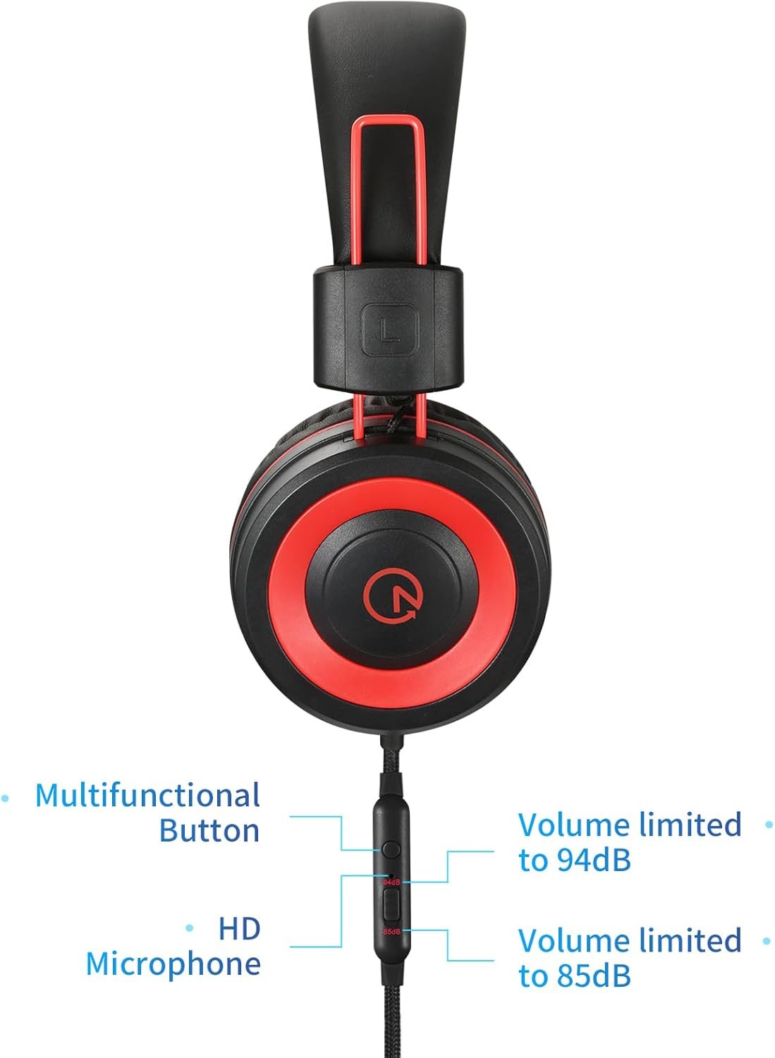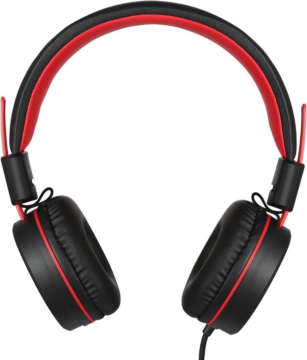 noot products Kids Headphones with Microphone K12 Stereo 5ft Long Cord with 85dB/94dB Volume Limit Wired On-Ear Headset for iPad/Amazon Kindle,Fire/Toddler/Boys/Girls/School (Red Black)