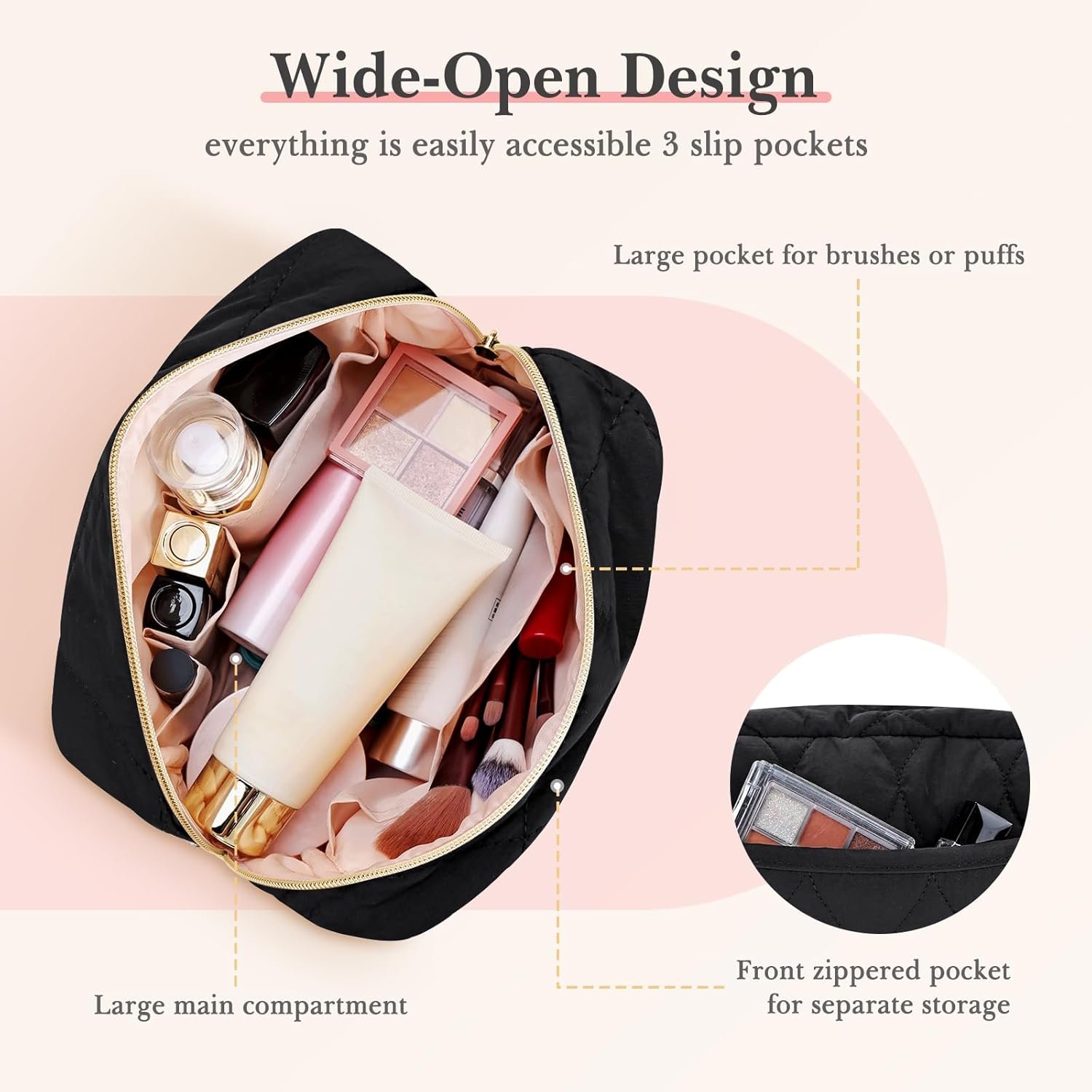 SPACIOUS & SMARTLY ORGANIZED:Sized at 8.6″ × 3.2″ × 5.8″, this cosmetic bag features 4 interior pockets and 1 front zipper pouch. Three slots are specially designed for lipsticks, tweezers, or eyeliners, while the front pocket is perfect for storing small, quick-access items.