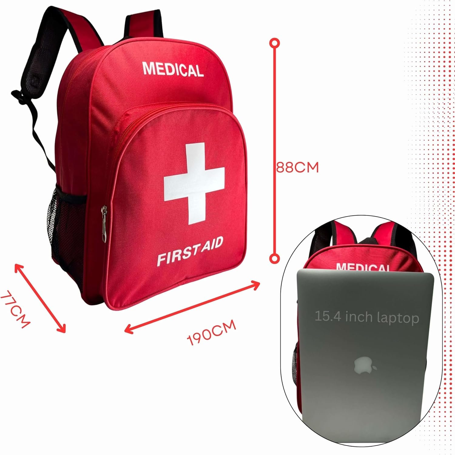 SMART ORGANIZATION | A PRACTICAL Red Medical Emergency Backpack As a practical medical backpack, the size is 15.7 in *11.5 in *7.8 in, its interior is thoughtfully laid out to hold all your essential first aid supplies, from simple bandages and ointments to larger items like splints or cold packs. Multiple compartments and elastic loops keep everything neat and easy to find, allowing anyone to access what they need quickly in a stressful situation.