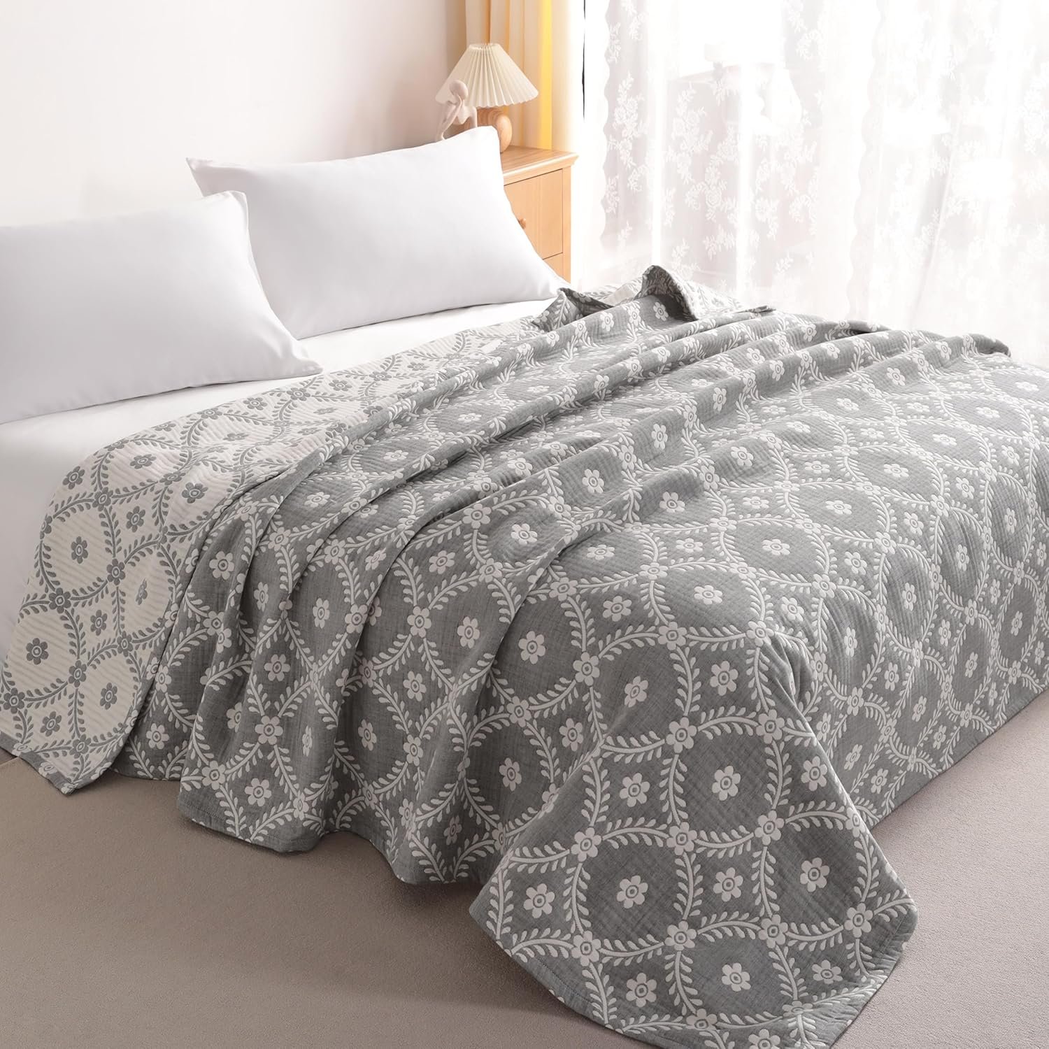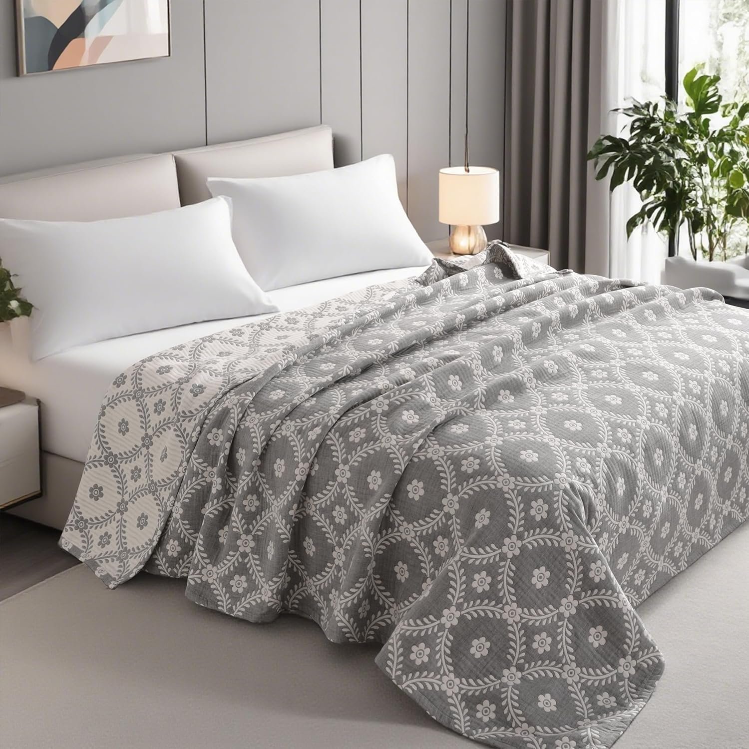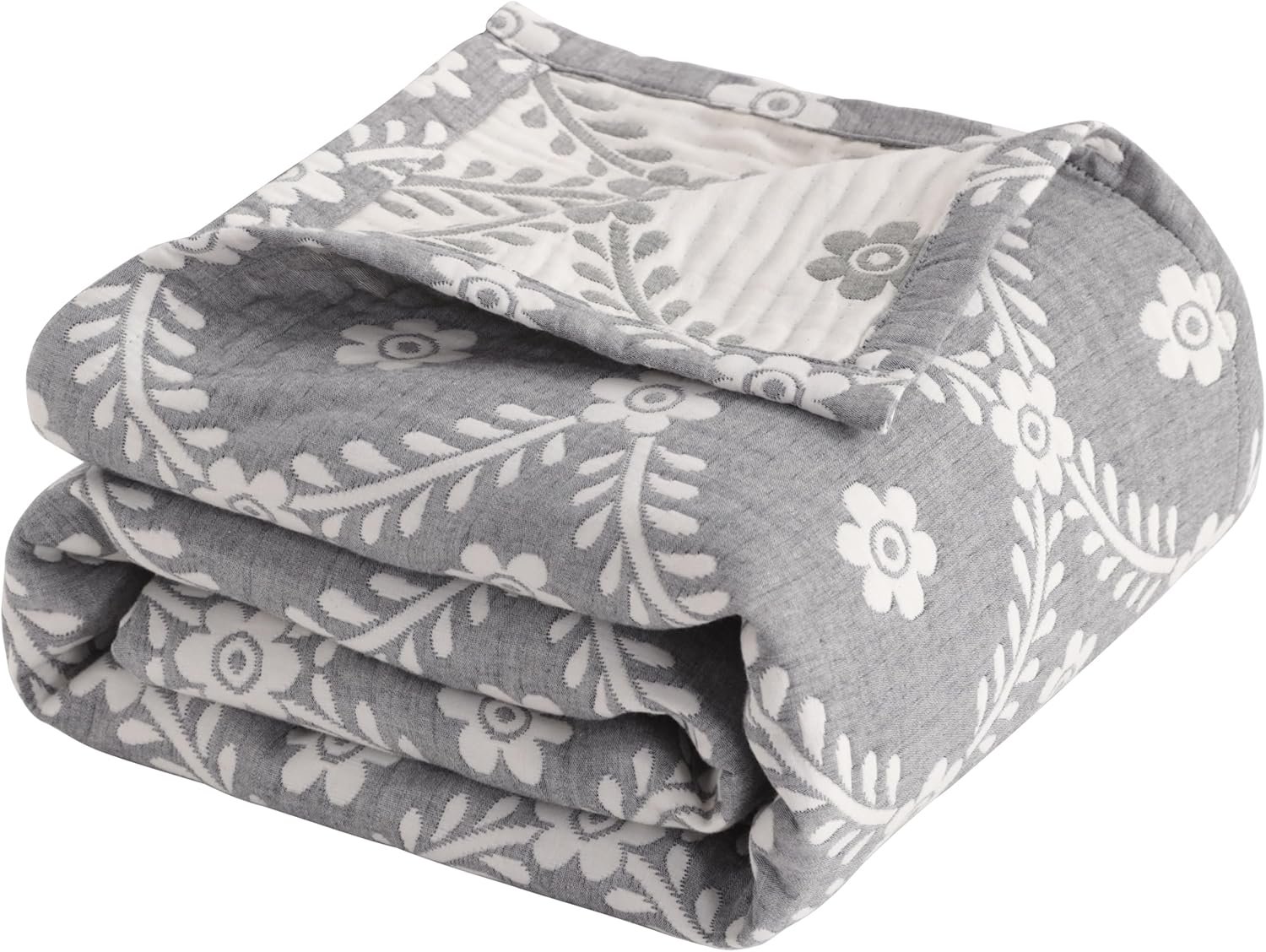 NTBAY 3 Layers Cotton Muslin 106×92 King Bed Blanket, Super Soft Breathable Thermal Yarn Dyed Quilt for Adults, Perfect Lightweight Blanket for Couch Sofa Bed All Seasons, Grey Garlands