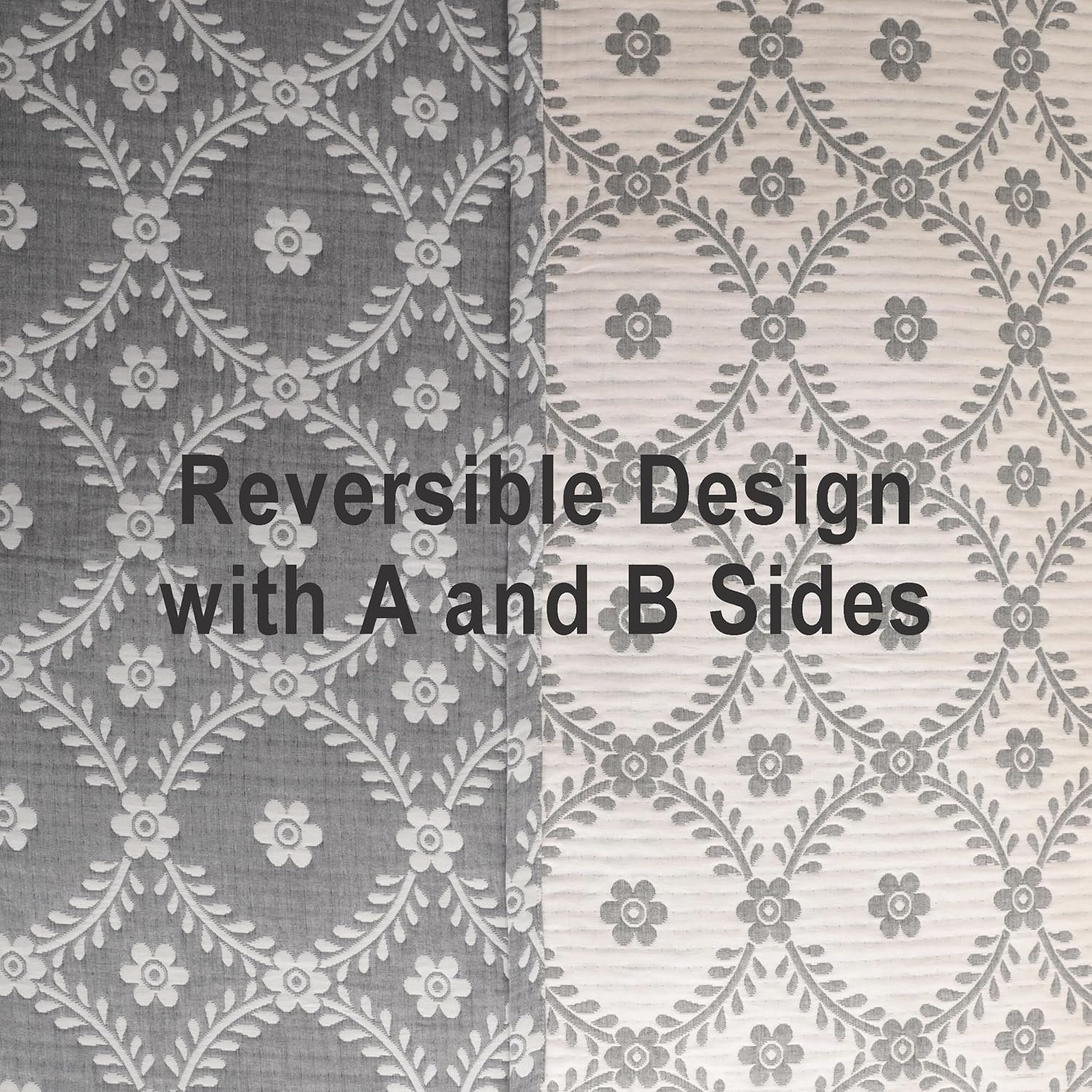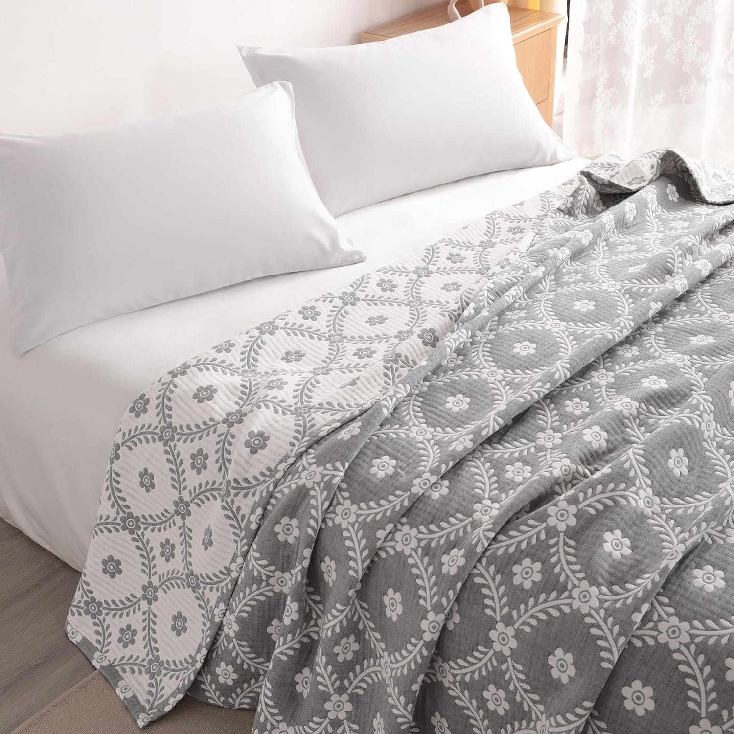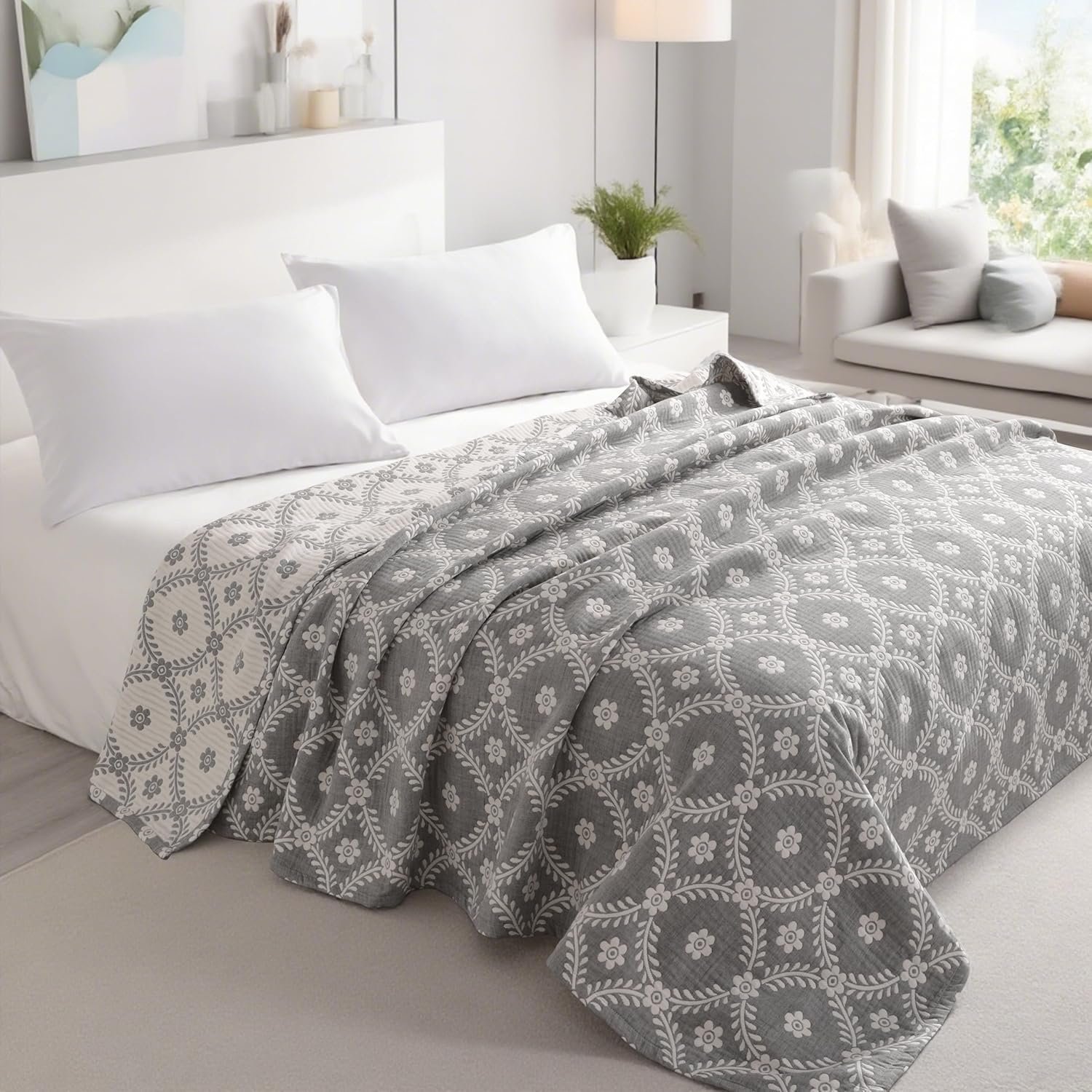 NTBAY 3 Layers Cotton Muslin 106×92 King Bed Blanket, Super Soft Breathable Thermal Yarn Dyed Quilt for Adults, Perfect Lightweight Blanket for Couch Sofa Bed All Seasons, Grey Garlands
