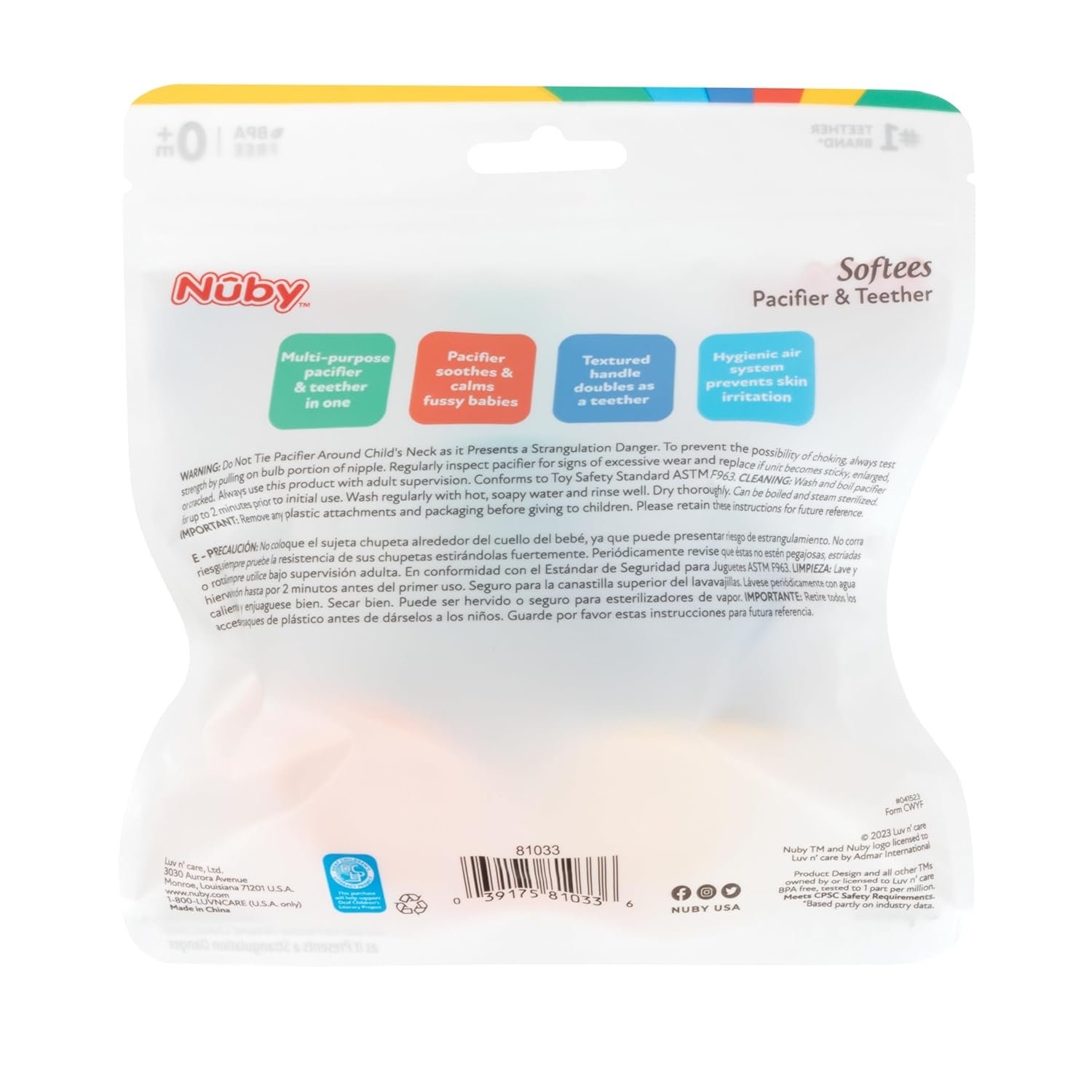 Nuby’s Softees Baby Pacifier and Teether is the ideal multi-purpose baby essential. Designed to comfort and soothe your little one, the Softees feature soft, durable silicone and a textured handle for providing relief to baby’s tender gums. With a soothing and comfortable design, the all-silicone pacifier is designed to be lightweight so your baby will have an easier time keeping it in their mouth, rather than dropping it on the floor. With five in a package, you always have a spare pacifier that your child will love. With its thoughtful design and textured teether, the Softee Pacifier and Teether is sure to bring comfort and a smile to you and your little one. Nuby always keeps you and your family’s safety in mind. The Softees Pacifiers and Teethers are made of 100% silicone.