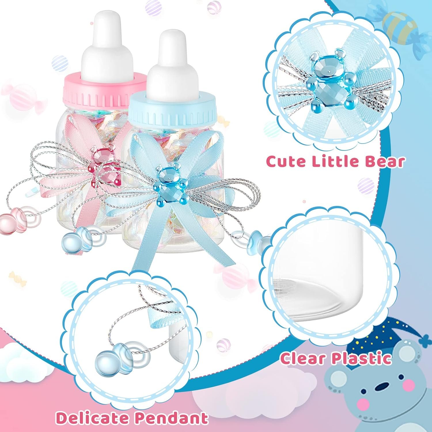 Thoughtful Design: this mini baby bottle for baby shower adopts baby bottle design, front decorated with bear, ribbon and bow, very suitable for baby shower parties