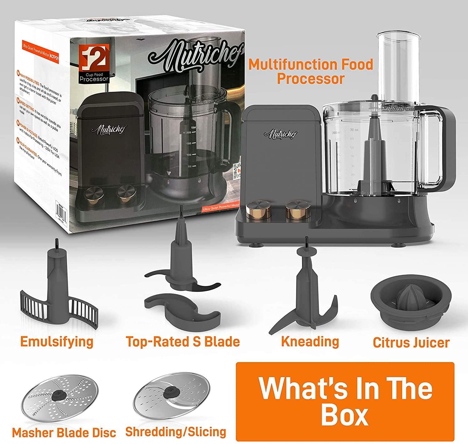 6 ATTACHMENT BLADE: The 12 cup food processor set includes slicer/shredder & masher blade disc, chopper, dough kneading, & emulsifying blades, & citrus juicer to easily mash nuts, shred vegetable/fruit, chop meat, mix flour & more w/ just 1 machine