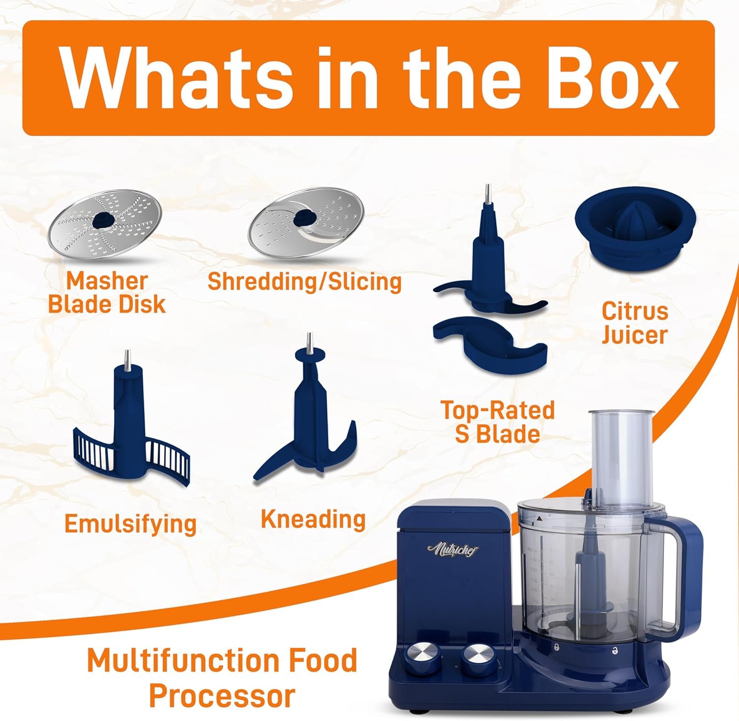6 ATTACHMENT BLADES: Introducing the 12-cup food processor, featuring a slicer/shredder, masher blade disc, chopper, dough kneading, emulsifying blades, and a citrus juicer. Easily mash nuts, shred vegetables or fruits, chop meats, and mix flour.