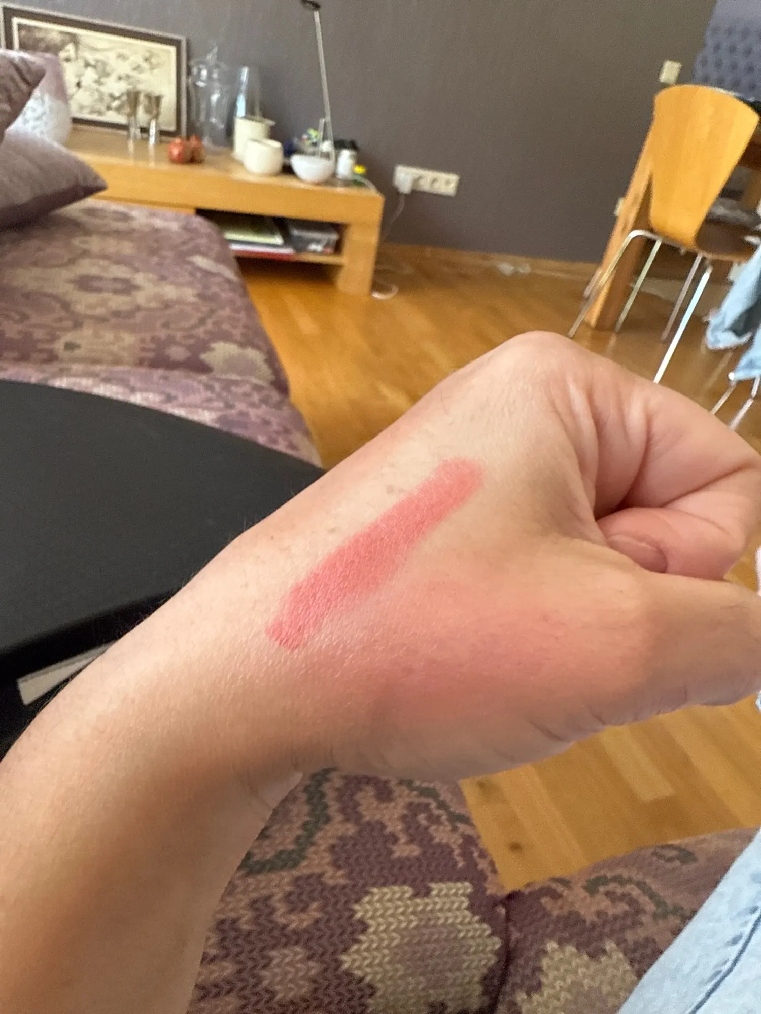 I thought the blush would be lighter, but it’s okay, it blends well, has a delicate scent. The quality is good. The small packaging is easy to take with you in your purse. It’s both blush and lipstick.