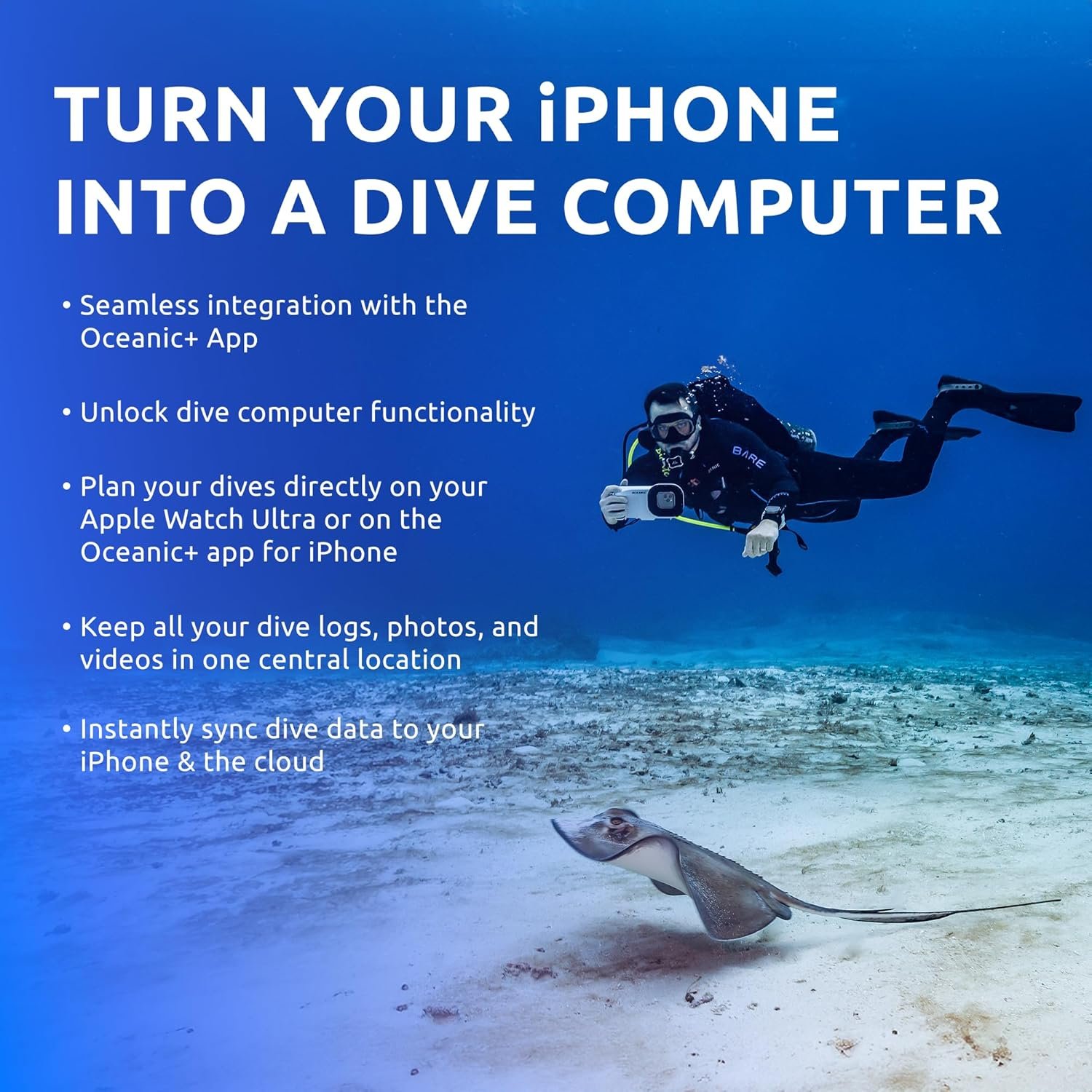 TURN YOUR iPHONE INTO A DIVE COMPUTER: Integrates seamlessly with OCEANIC+ app developed for the Apple Watch Ultra, unlocking scuba dive computer functionality