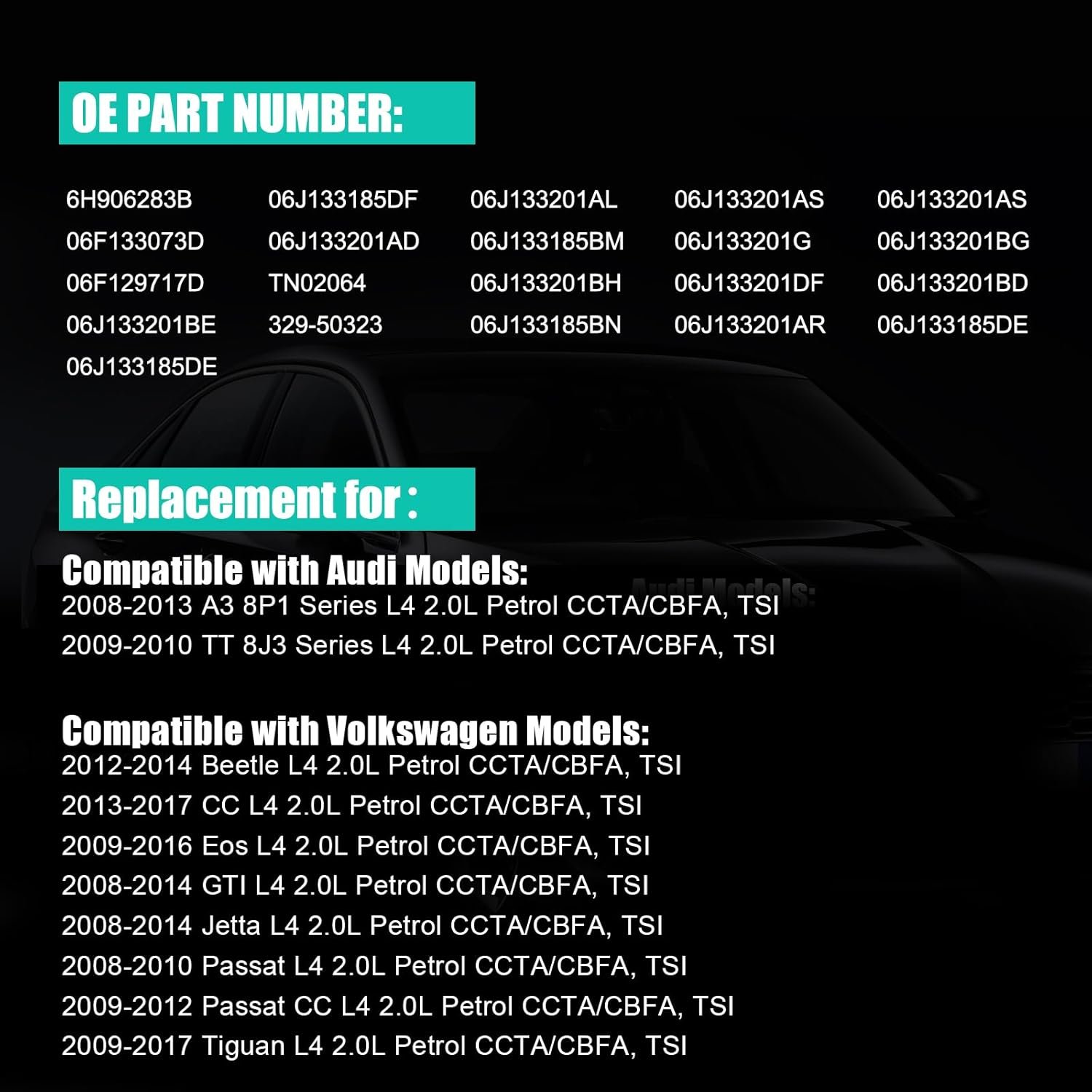 【Fitment】Compatible with Audi A3 L4 2.0L 2008-2013, TT L4 2.0L 2009-2010; Compatible with VW/Volkswagen Beetle L4 2.0L 2012-2014, CC L4 2.0L 2013-2017, Eos L4 2.0L 2009-2016, GTI L4 2.0L 2008-2014, Jetta L4 2.0L 2008-2014, Passat L4 2.0L 2008-2010, Passat CC L4 2.0L 2009-2012, Tiguan L4 2.0L 2009-2017