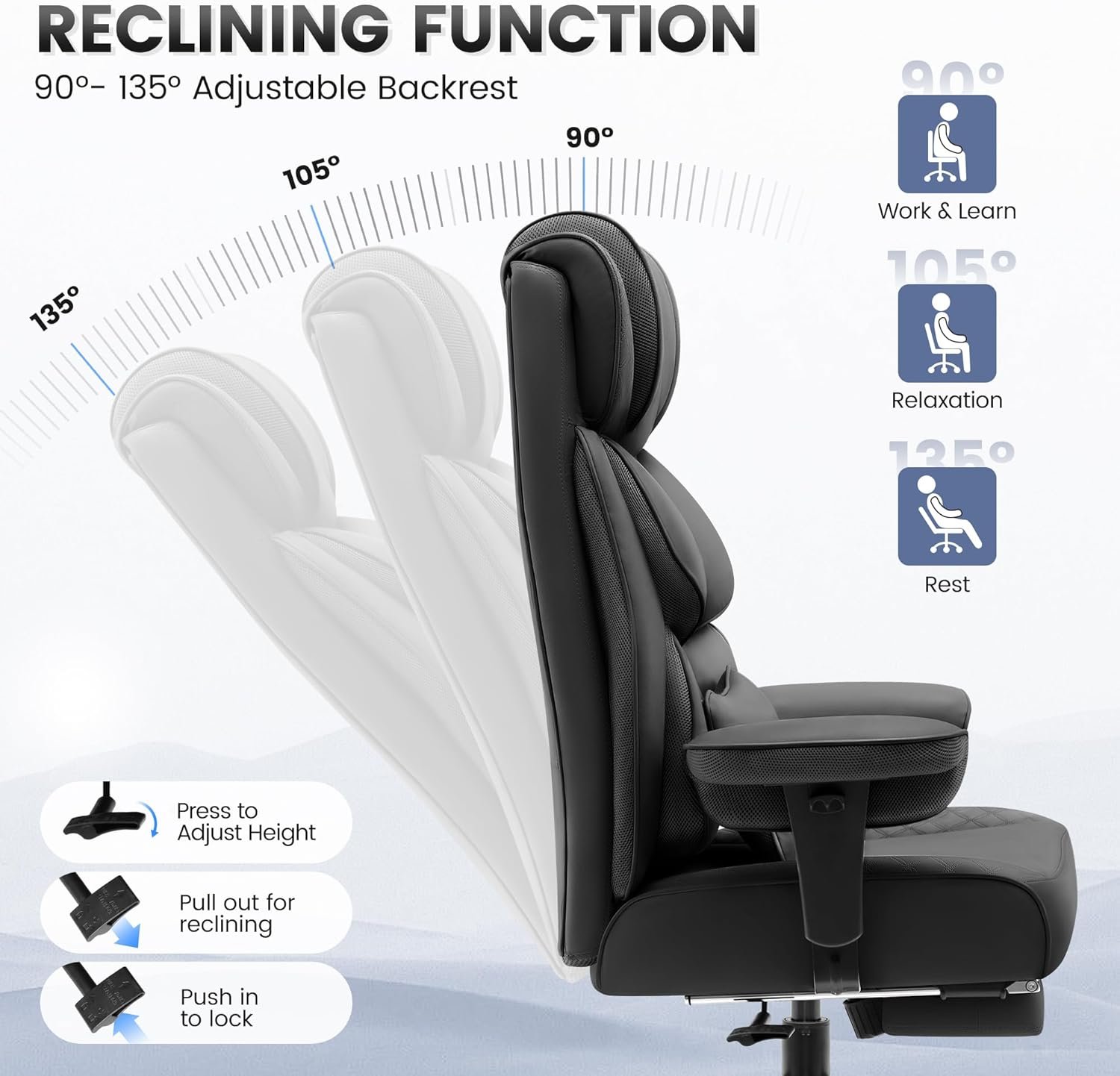 𝐕𝐞𝐫𝐬𝐚𝐭𝐢𝐥𝐞 𝐀𝐝𝐣𝐮𝐬𝐭𝐚𝐛𝐢𝐥𝐢𝐭𝐲: You can effortlessly customize the seat height, backrest angle, and armrest positions with this big and tall office chair. It also swivels 360°, adapting seamlessly to various desk heights and office scenarios. Whether you’re working, relaxing, or taking a short break, the retractable footrest ensures your lower body stays comfortable, meeting all your diverse work and relaxation requirements