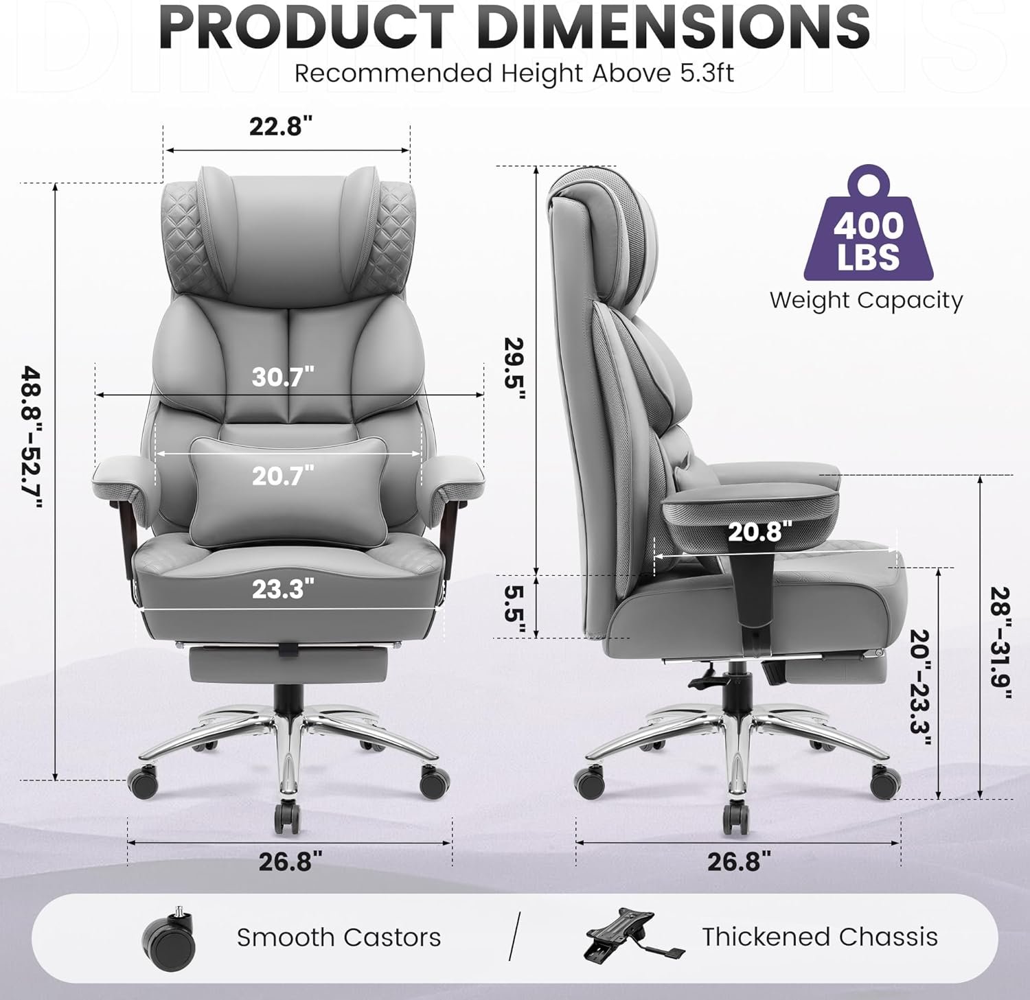 Office Desk Chair, Big and Tall Leather Gaming Chair with Footrest, Wide Ergonomic Comfy Executive High-Back Reclining Computer Chairs, Swivel Rolling Wheels and Padded Lumbar Support, Gray