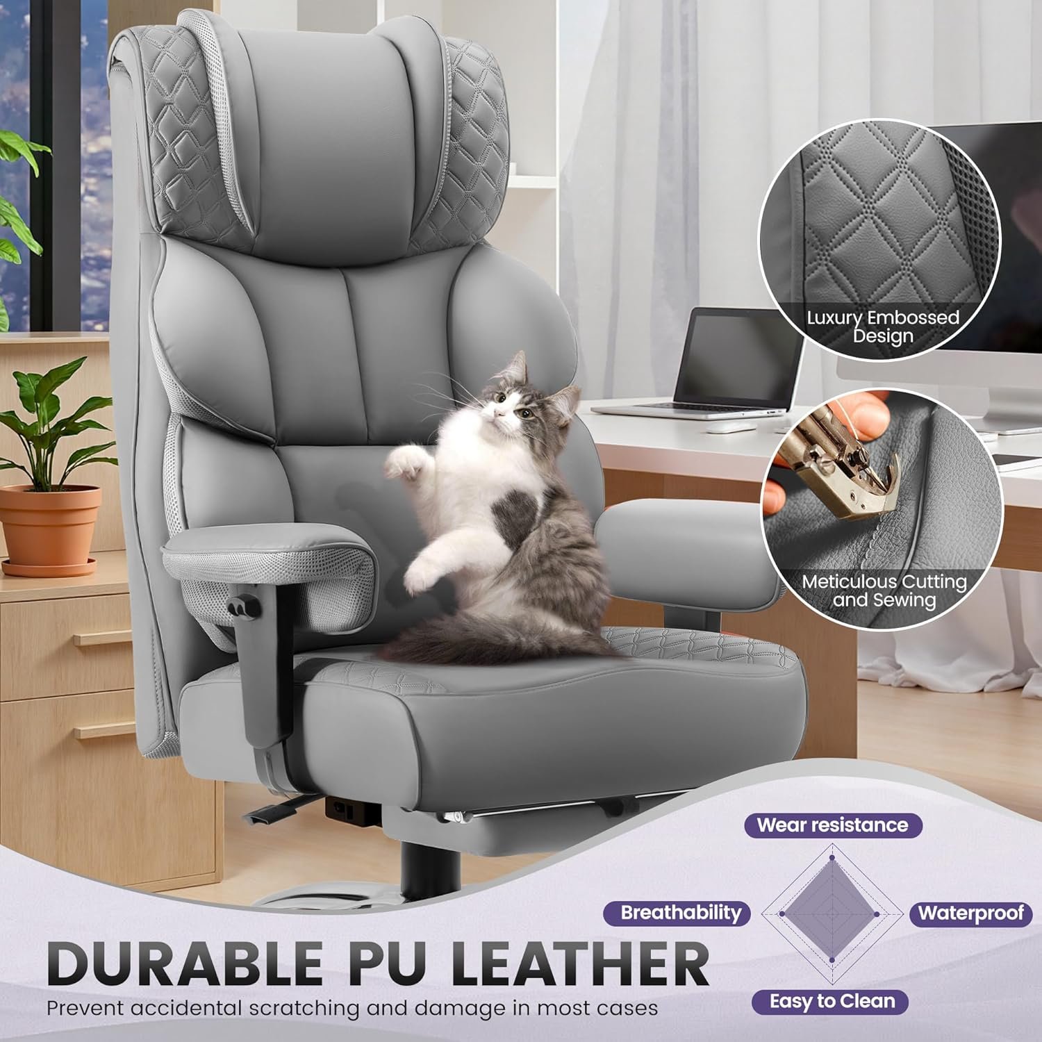 𝐇𝐢𝐠𝐡-𝐄𝐧𝐝 𝐋𝐮𝐱𝐮𝐫𝐲 𝐋𝐞𝐚𝐭𝐡𝐞𝐫: This office chair is crafted with a special type of top-notch imitation leather that’s not only luxurious in appearance but also impressively resilient against cat scratches. This leather has a fine-grained texture, mimicking the look and feel of genuine cowhide with a natural sheen that elevates the aesthetic of any room