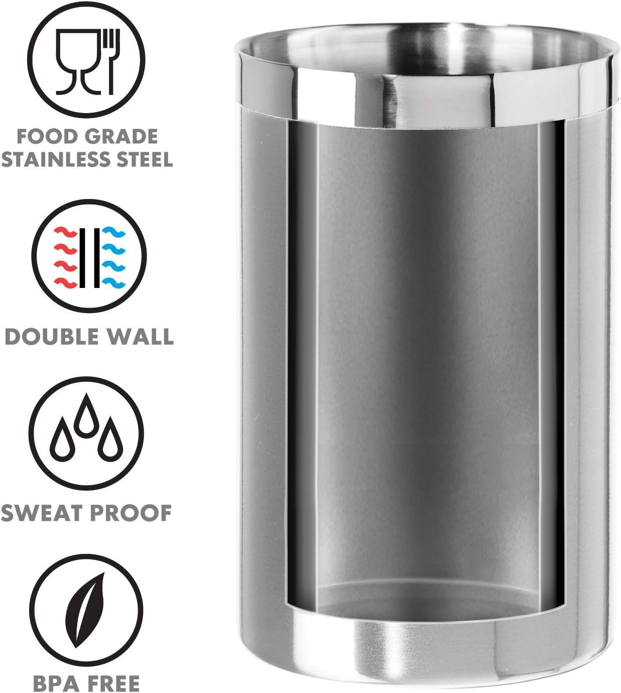 INSULATED WINE COOLER BUCKET: A double wall construction provides insulation so that your white wine or champagne remains at its proper serving temperature longer. Also keeps red wine at a perfect cellar temperature for longer