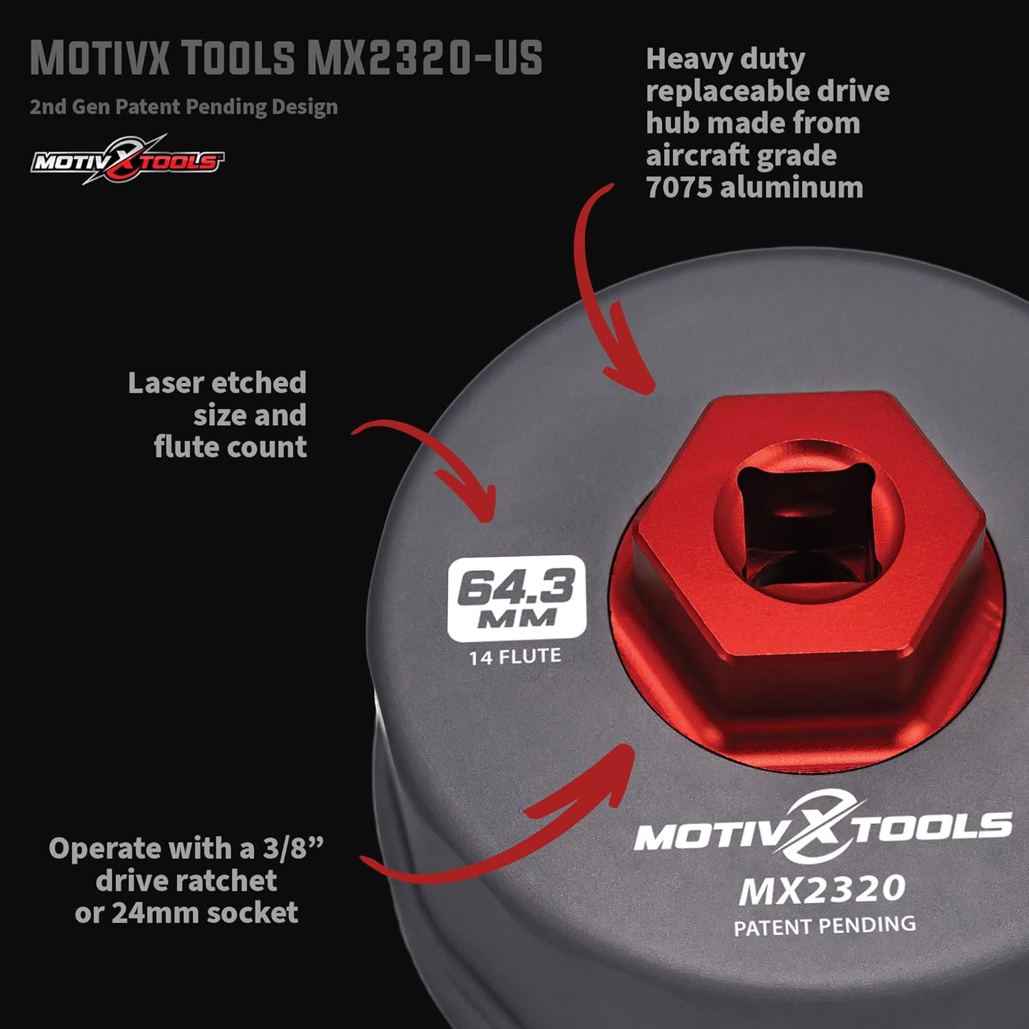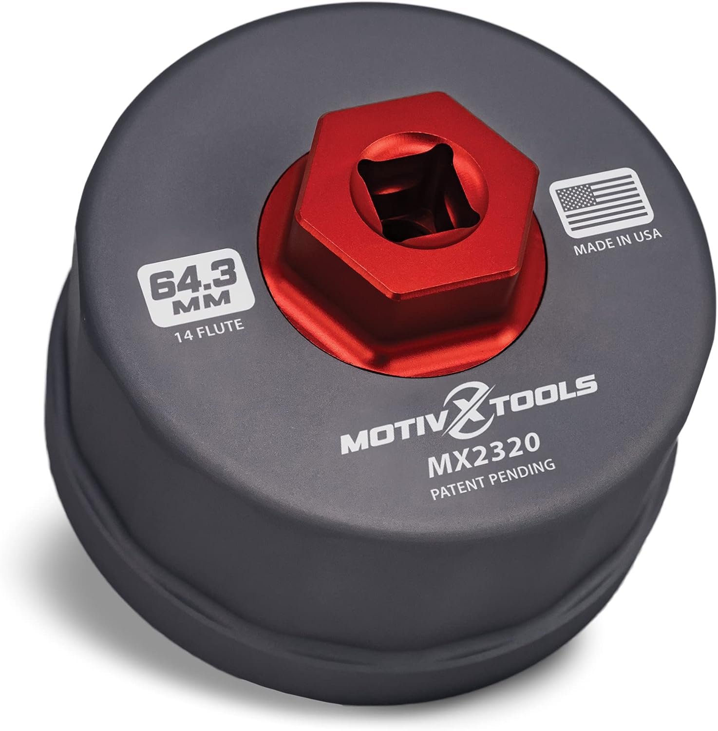 Model MX2320-US Size 64.3mm Flutes 14 Construction Machined Material Aluminum Square Drive Size 3/8″ Hex Drive Socket Size 24mm | 15/16″ Finish Anodized Made In United States of America