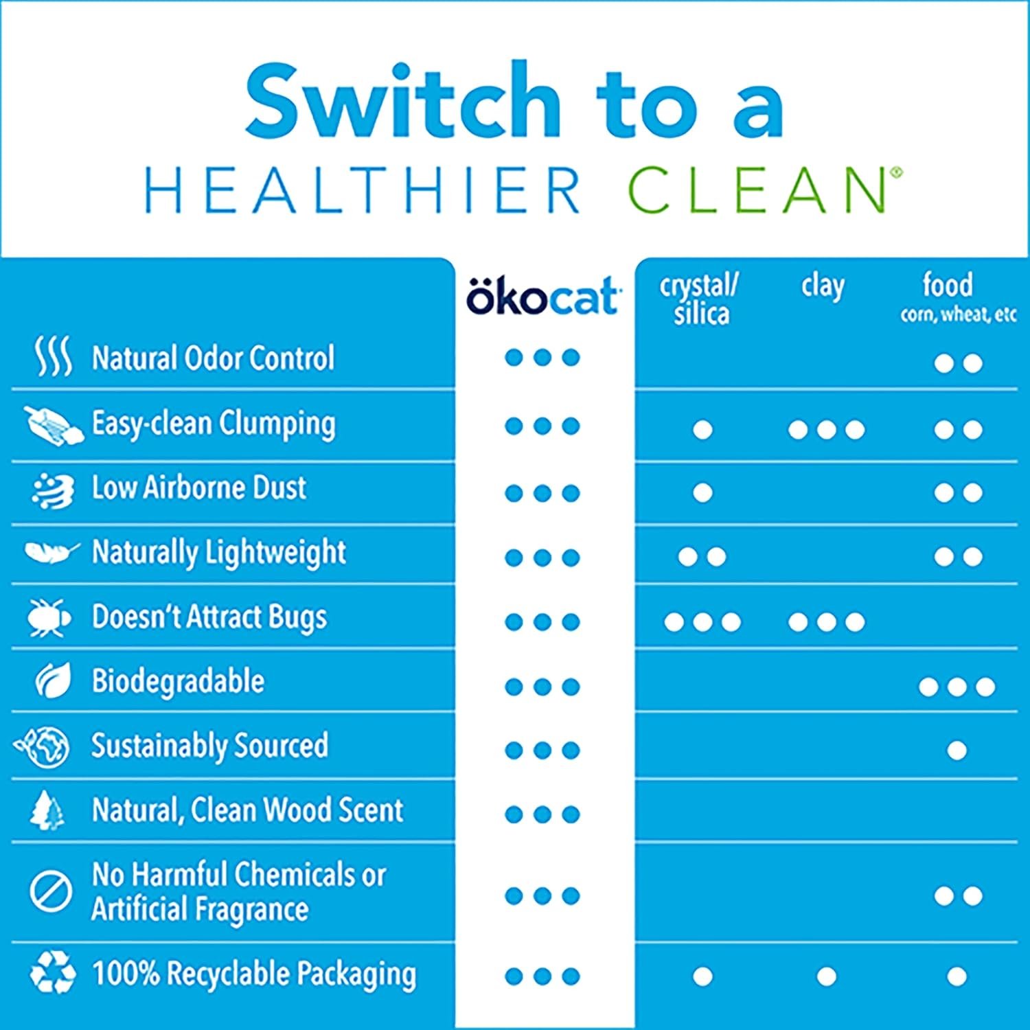Switch to a superior natural cat litter that’s cleaner and healthier for your feline, family, and home. Our next-generation kitty litter is made entirely from sustainably sourced, responsibly rescued natural wood fiber. Free from harmful chemicals, synthetic dyes, and artificial fragrance, ökocat litter boasts outstanding plant-based odor control. Best of all, our biodegradable clumping formula is free from powdery clay dust for added cleanliness. oko is German for “eco” or ecological, meaning green or organic. okocat litter is made from 100% reclaimed wood that comes from the earth and can be returned to the earth.The online excusive box does contain an inner plastic bag liner to help prevent leaking and any moisture. This bag is recyclable with #4 for drop-off plastic recycling or pick up services like Ridwell.