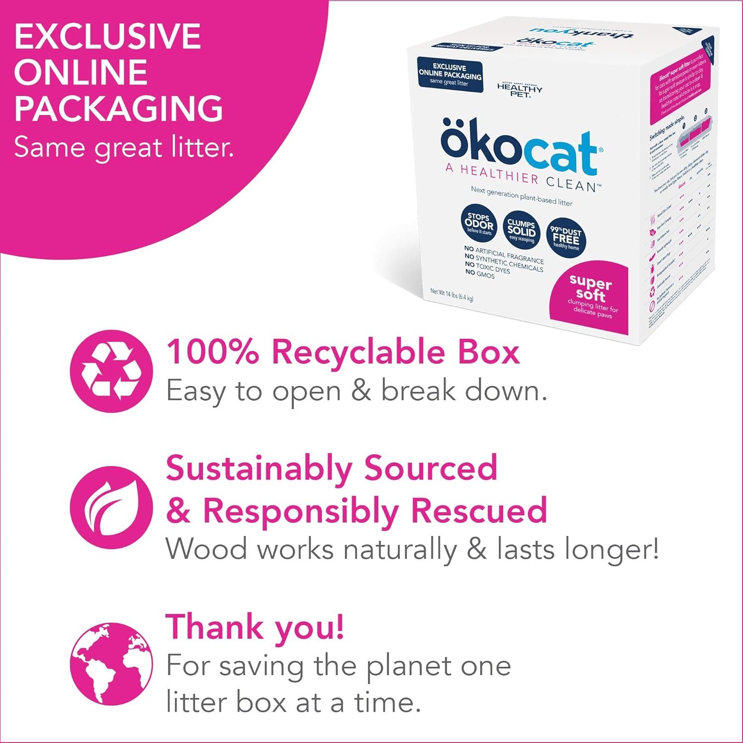 Switch to a superior natural cat litter that’s cleaner and healthier for your feline, family, and home. Our next-generation kitty litter is made entirely from sustainably sourced, responsibly rescued natural wood fiber. Free from harmful chemicals, synthetic dyes, and artificial fragrance, ökocat litter boasts outstanding plant-based odor control. Best of all, our biodegradable clumping formula is free from powdery clay dust and compostable or flushable for added convenience and cleanliness. oko is German for “eco” or ecological, meaning green or organic. okocat litter is made from 100% reclaimed wood that comes from the earth and can be returned to the earth. Our online exclusive packaging is recyclable and easy to break down with a leak-proof bag inside. Just cut open the bag corner then pour from the designated box corner or scoop into litter box.