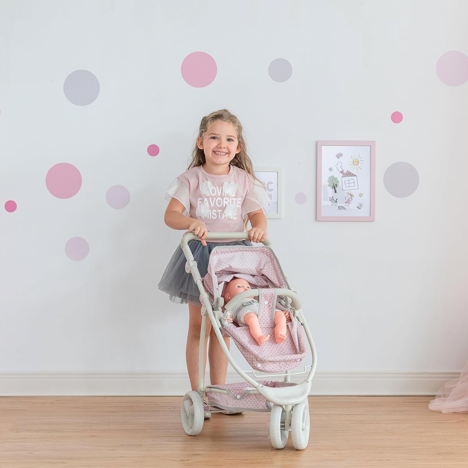 Elevate your little one’s pretend play with this charming baby doll stroller set. Designed for endless adventures, this versatile stroller easily transforms between a classic buggy and a jogging stroller style, making it perfect for playdates, park visits, and indoor fun. With its sturdy frame and smooth all-terrain wheels, kids can effortlessly push their favorite dolls around in this small stroller built for imaginative storytelling.