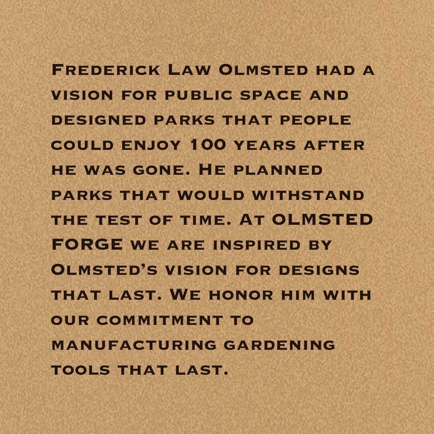 5 Piece OLMSTED FORGE Strong and Sturdy Powder-Coated Solid Steel Garden Tool Set includes a Big Scoop, Hand Trowel, Hand Rake, Cultivator and Transplant Tool. ABOUT OLMSTED FORGE: Frederick Law Olmsted is regarded as the founder of American landscape architecture and is best known for designing Central Park in New York City. Olmsted produced designs and plans for hundreds of parks throughout the U.S. during the late 1800s. Frederick Law Olmsted had a vision for public space and designed parks that people could enjoy 100 years after he was gone. He planned parks that would withstand the test of time. At OLMSTED FORGE we are inspired by Olmsted’s vision for designs that last. We honor him with our commitment to manufacturing gardening tools that last. Gardeners are a part of history and tradition like so many who have wokred the soil in this country for centuries. As Olmsted stated, “When immersed in nature, for a brief period, you can put yourself back in time.”