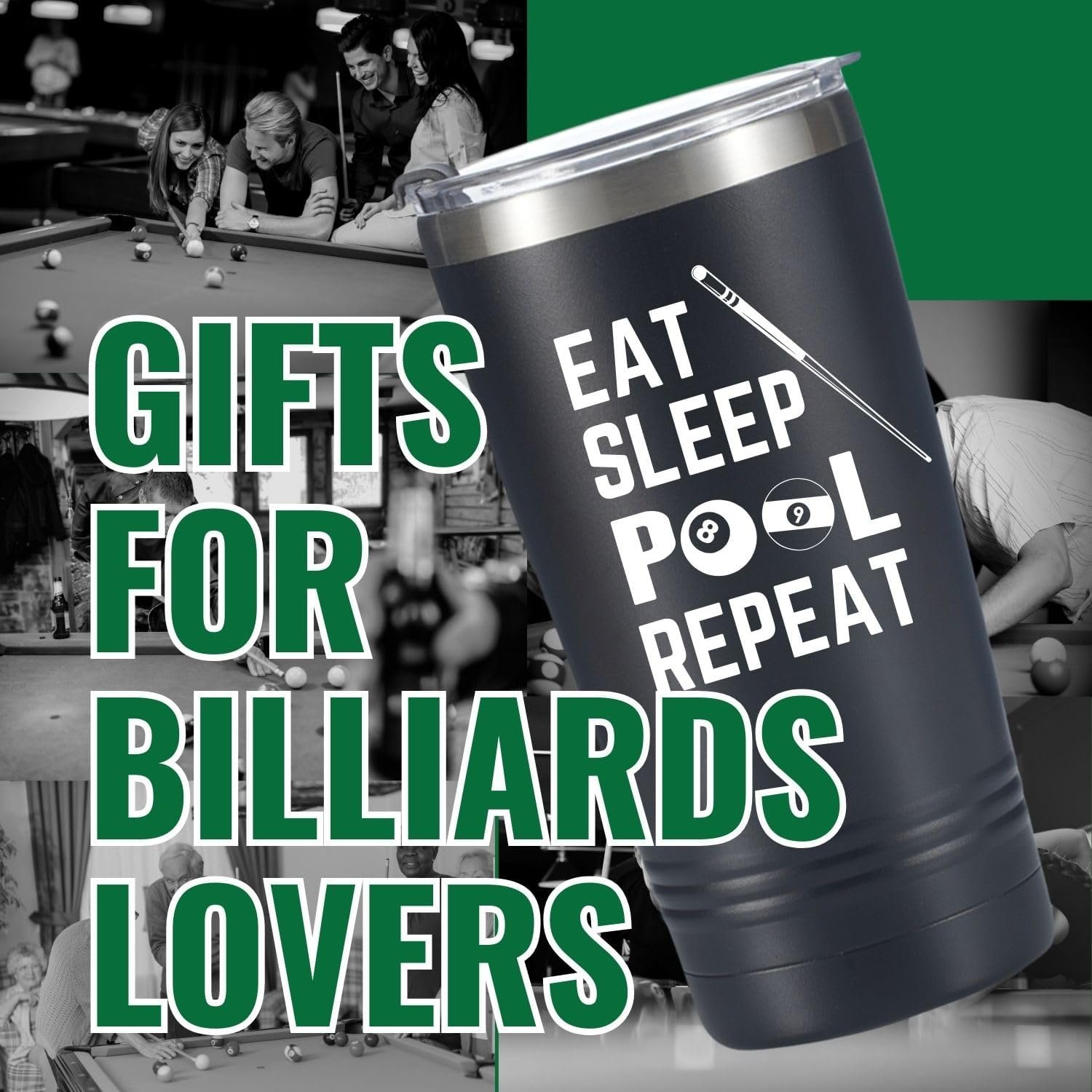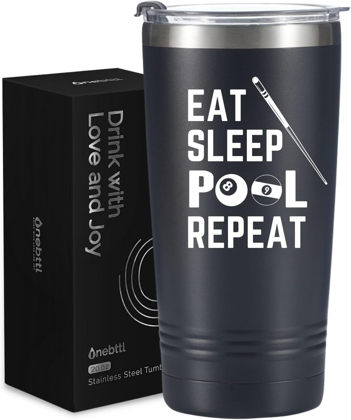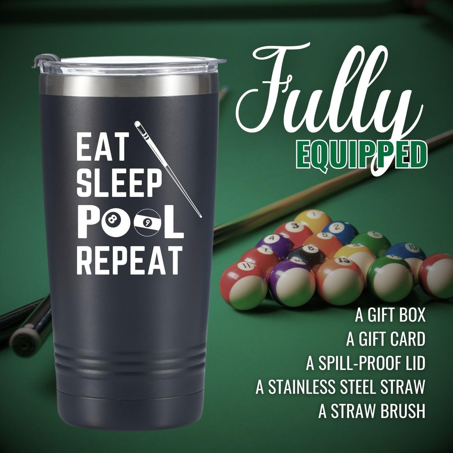 Onebttl Billiards Gifts for Men, EAT SLEEP POOL REPEAT, Billiards Accessories, Billiard King, Black Insulated 20oz Stainless Steel Travel Tumbler with Straw, Brush, Lid, and Gifts Box