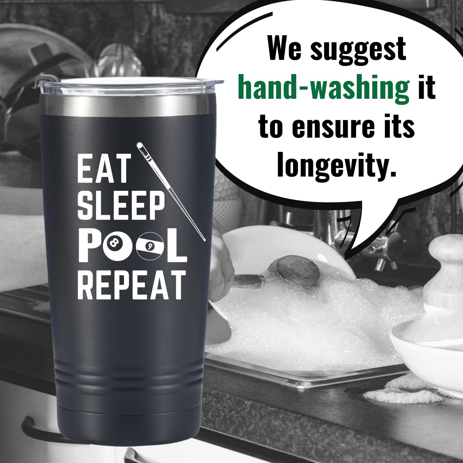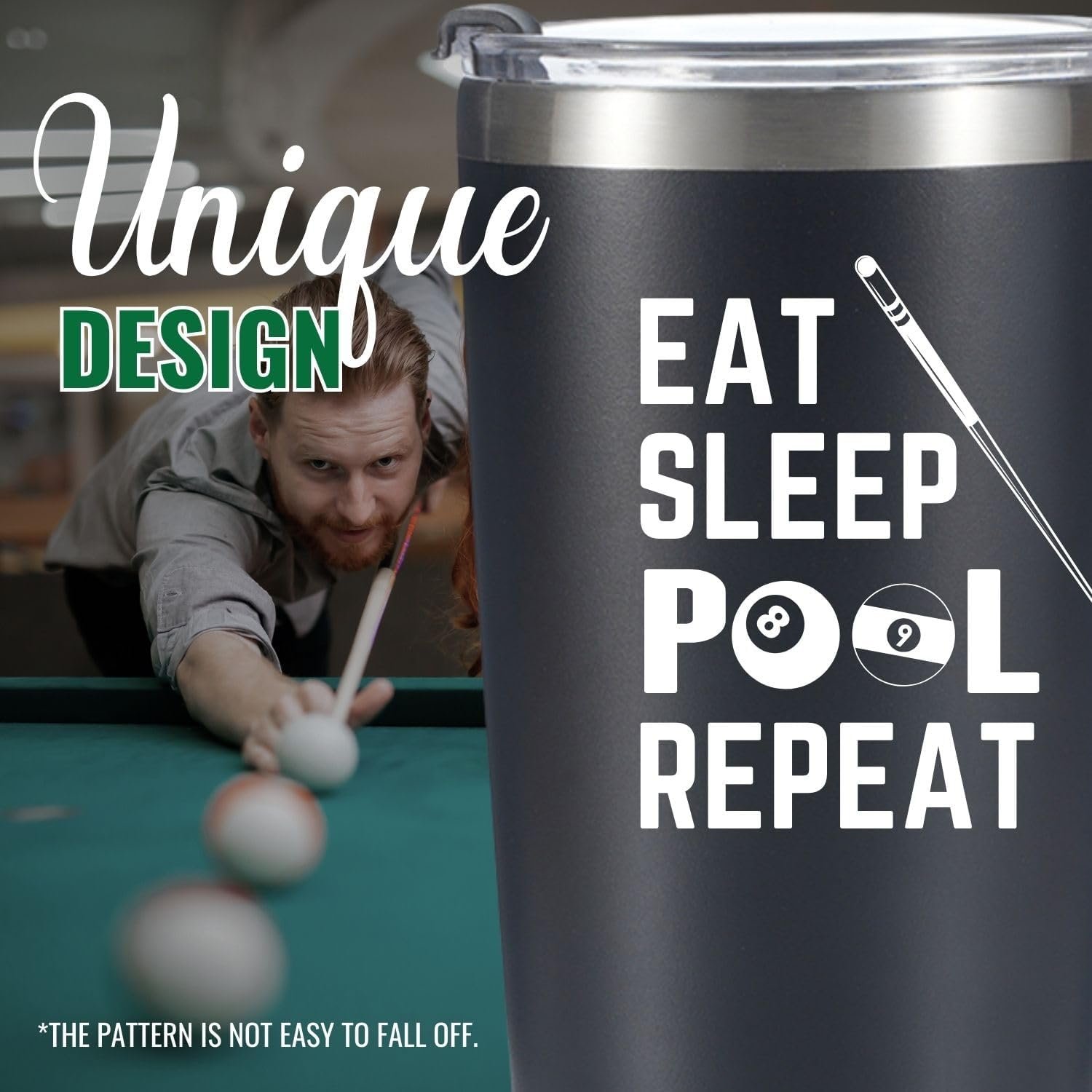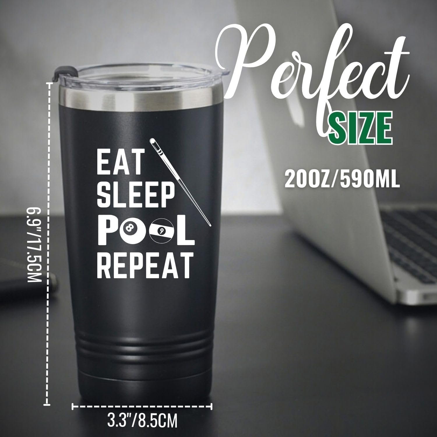 Onebttl Billiards Gifts for Men, EAT SLEEP POOL REPEAT, Billiards Accessories, Billiard King, Black Insulated 20oz Stainless Steel Travel Tumbler with Straw, Brush, Lid, and Gifts Box