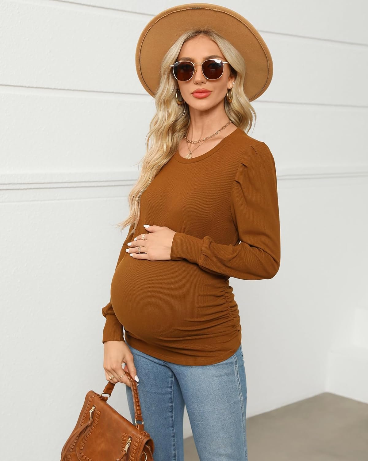 Onedreamer Women’s Maternity Shirts Puff Sleeve Round Neck Tunic Top Casual Pregnancy Clothes