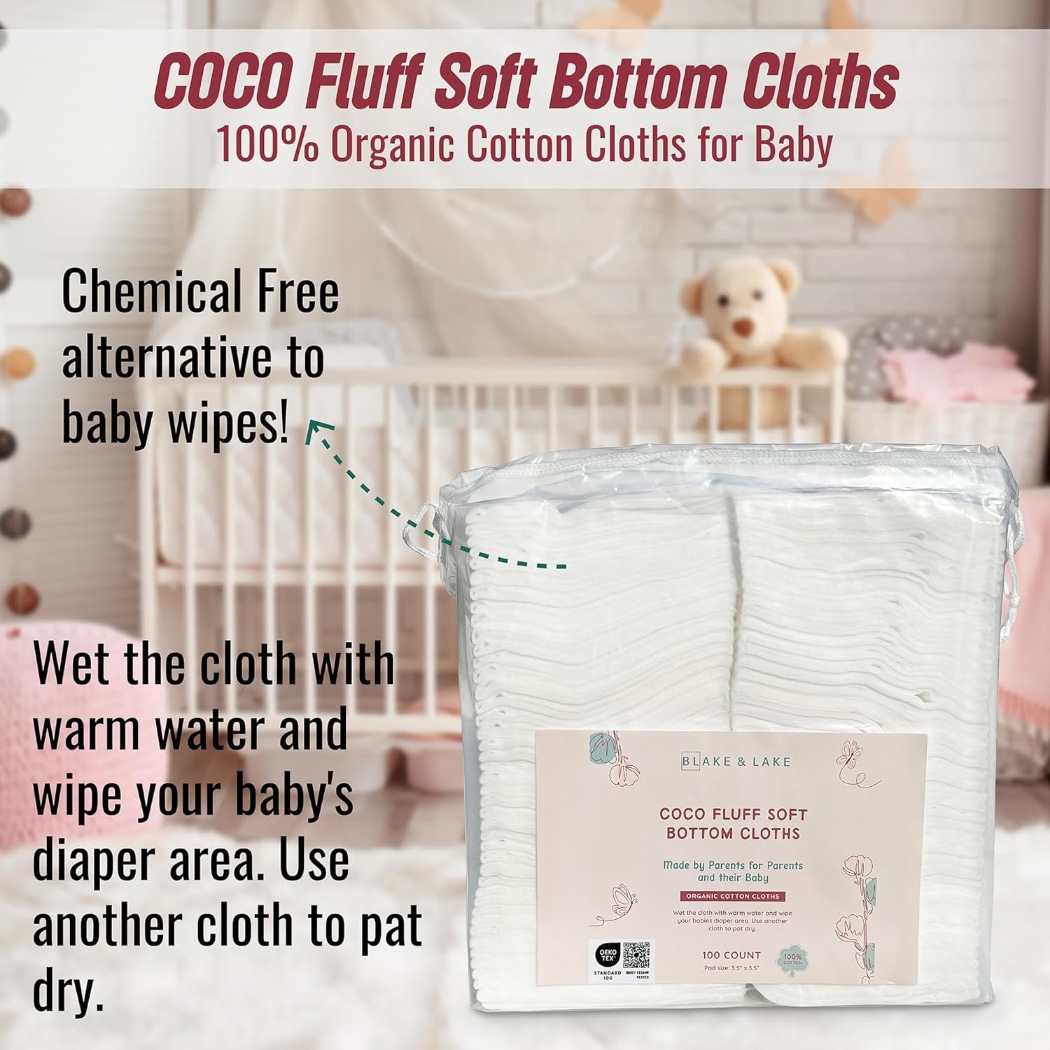 The best choice for your babies most sensitive areas! 100% Organic Cotton Cloths for Baby. Large and super absorbent, these organic dry cotton wipes are the perfect chemical-free alternative to baby wet wipes.Wet the cloth with warm water and wipe your baby’s diaper area. Use another cloth to pat dry. Super thick, soft and absorbent!