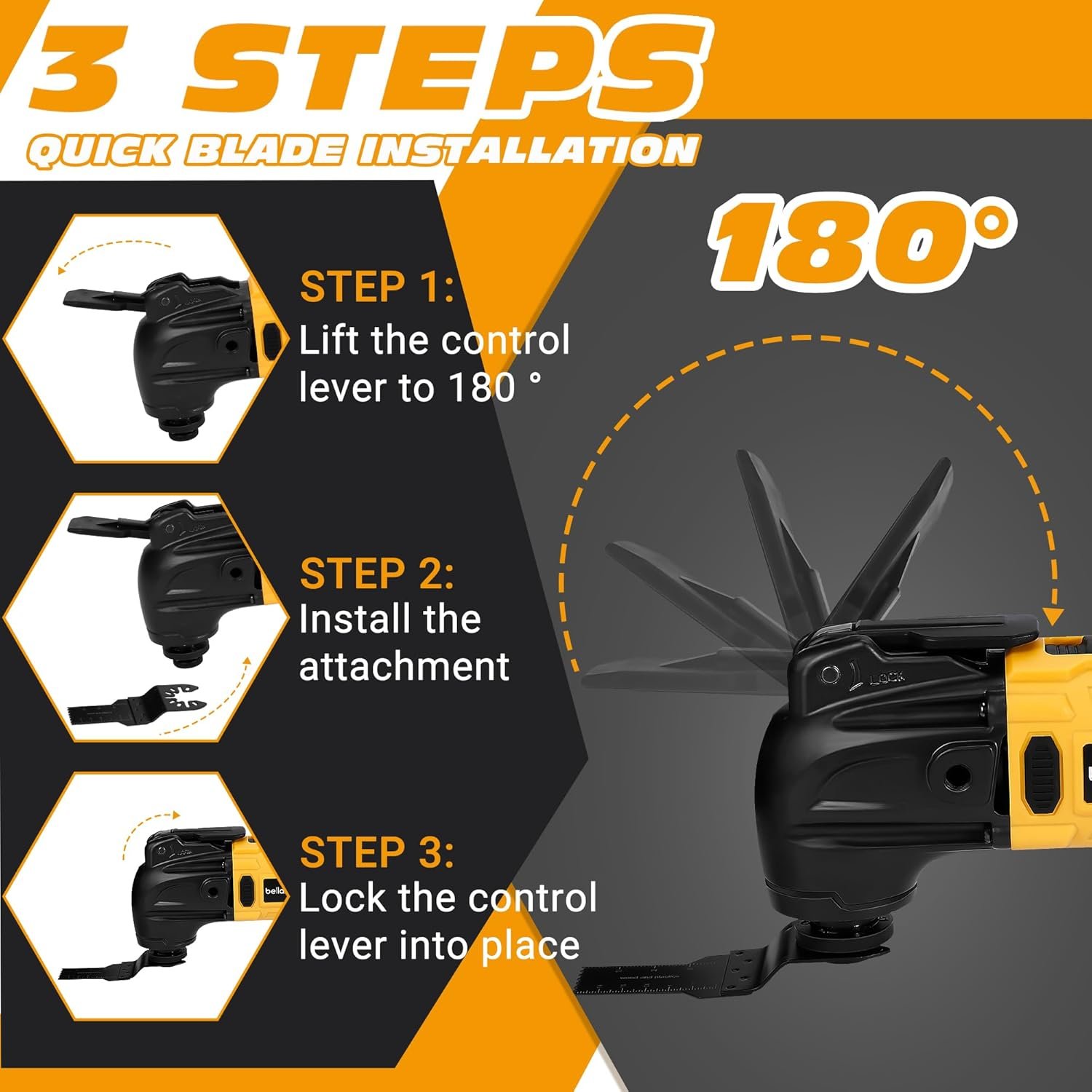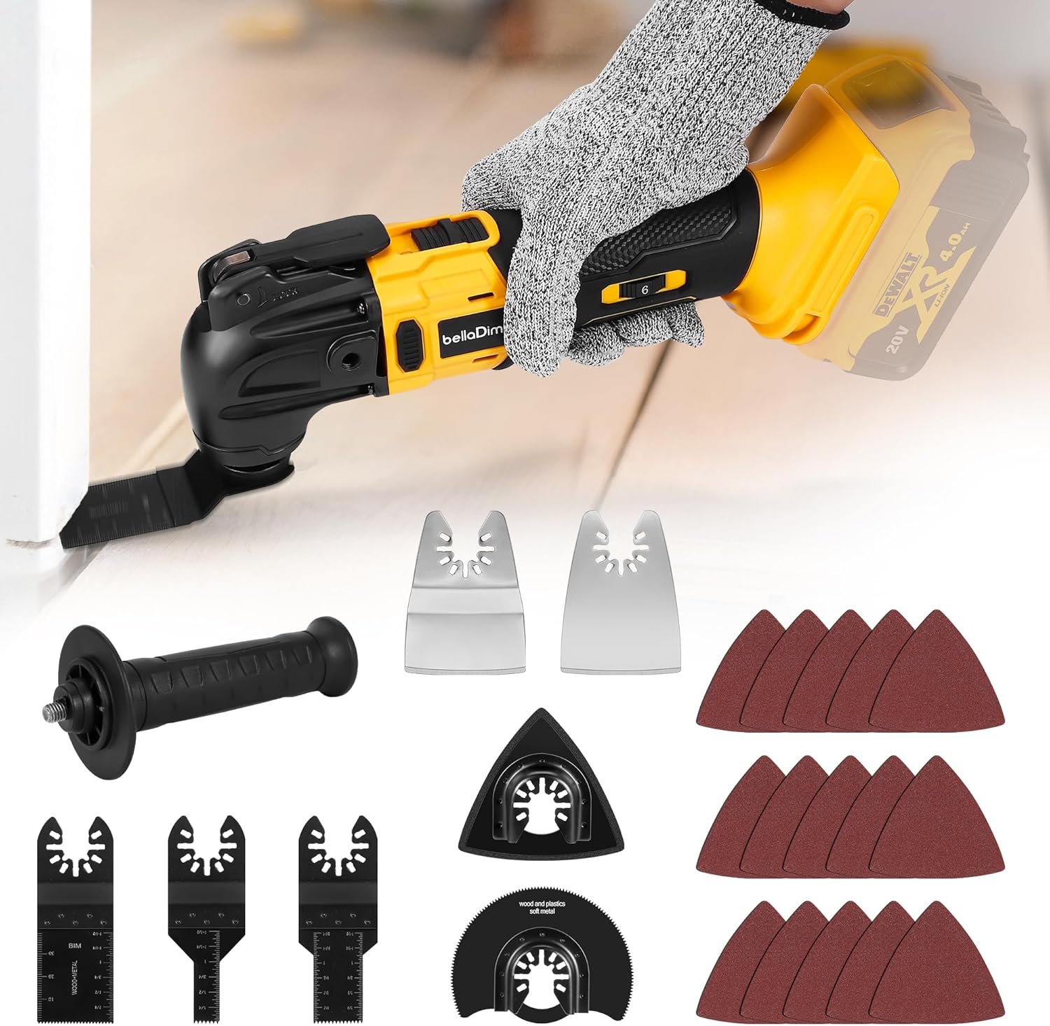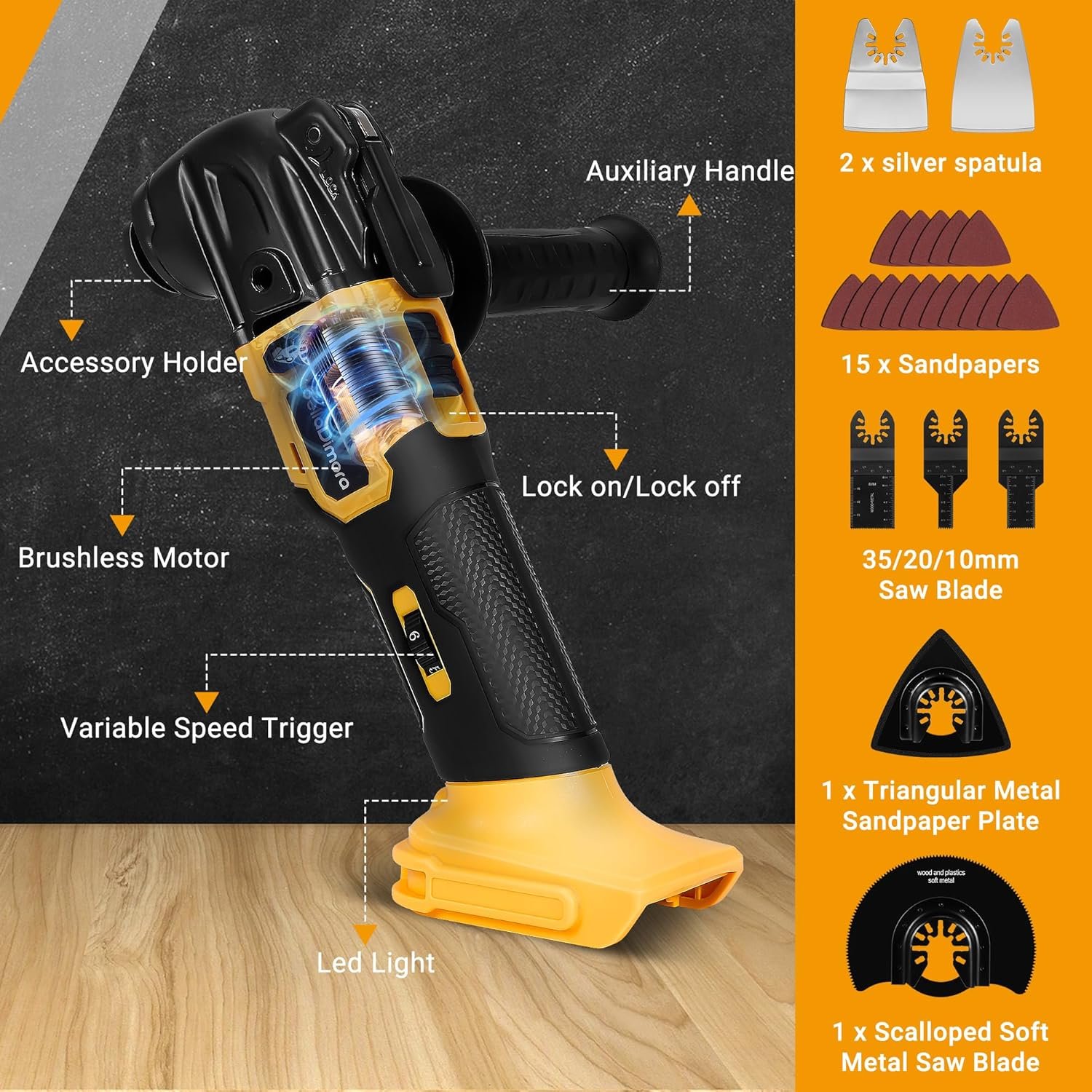 【Quick Blade Change System and Multi-functional Accessories】Equipped with a quick-change system that allows for tool-free blade and accessory swaps in seconds, improving work efficiency. The product comes with a 23-piece multi-functional accessory kit, including saw blades, sandpaper, scrapers, and more, meeting the cutting, sanding, and scraping needs for various materials (such as wood, metal, plastic, etc.)