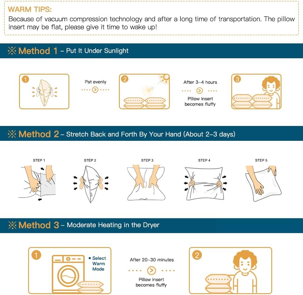 Warm Tips: The cushion insert is packed in vacuum compression. After opening the package, please follow the three methods in the instructions to make the pillow fluffy. It will create a wonderful rest time for you.