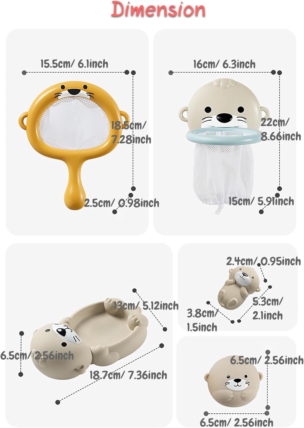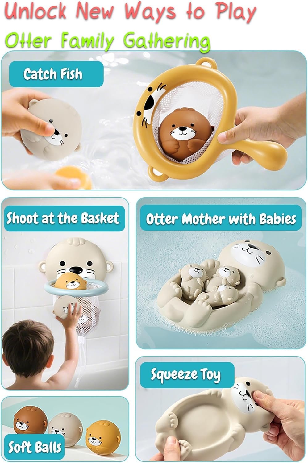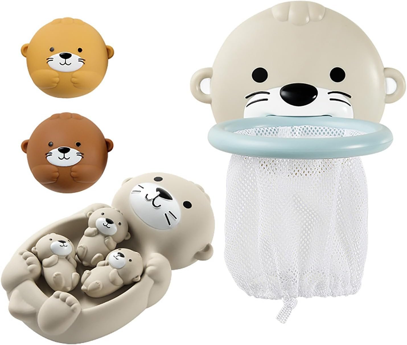 Soft Vinyl and Quality ABS Plastic Material: The soft otter balls and otter mother & child set are made of vinyl material features in soft and flexible. The otter bath toy can restore the original shape quickly after it is squeezed or pressed. The otter fishing net and basketball hoop are made of ABS plastic material features in smooth, solid and healthy.