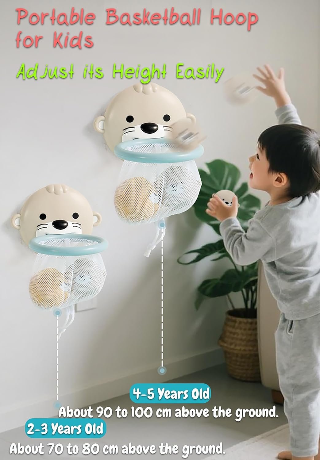 Otter Basketball Hoop: This otter basket toy comes with two strong suction cups that allow it to absorb firmly to smooth surfaces such as bathtubs, tiles, glass, etc. Not only can children shoot basketballs in the bathroom, but they can also play on other occasions.