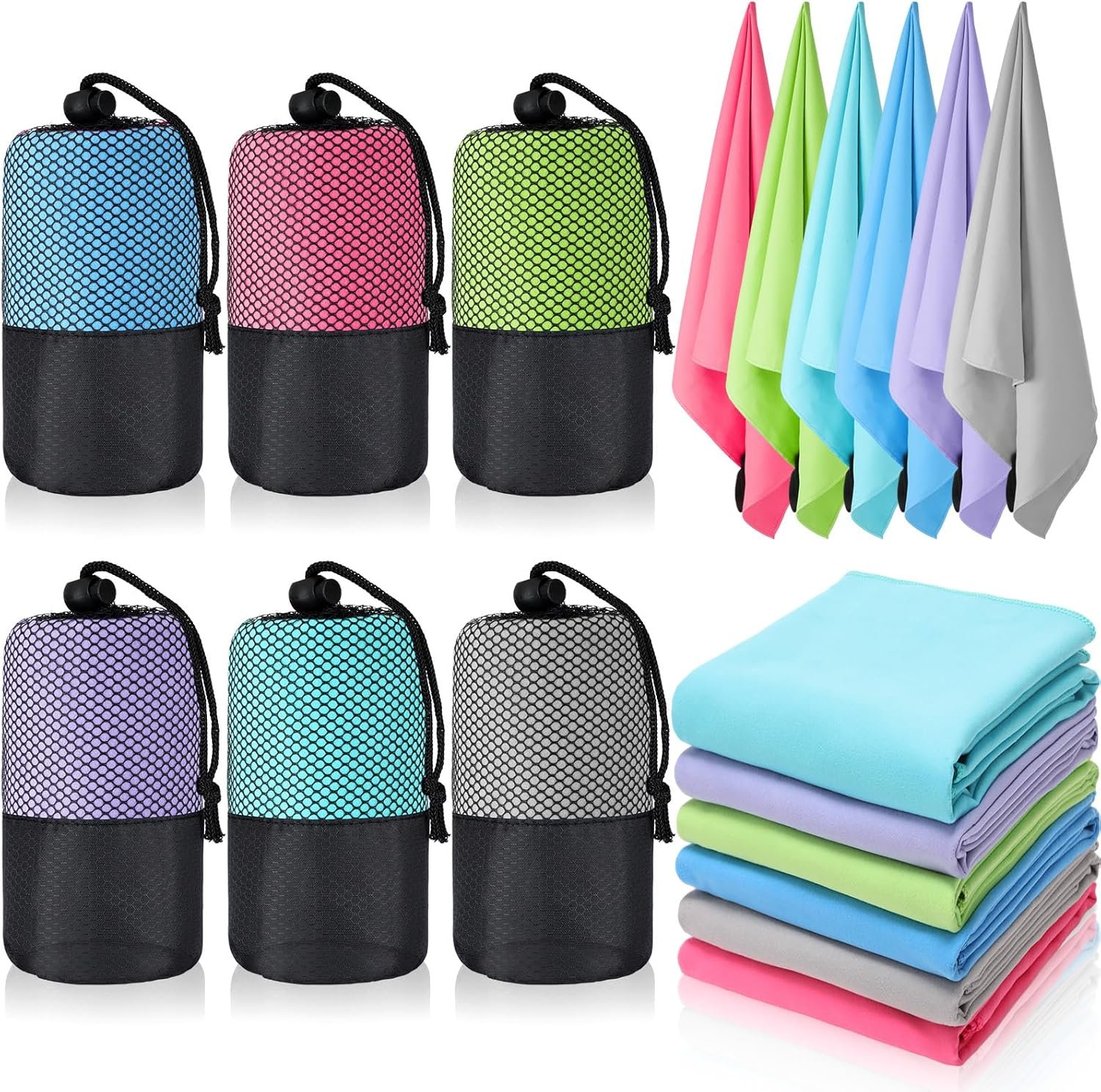 Oudain 6 Pieces Quick Dry Travel Towel Bulk, Microfiber Beach Towel with Bag Compact Soft Trip Towel Lightweight Adults Towel for Camping, Gym Beach Swimming Yoga, 20 x 39 Inches(Bright Color)