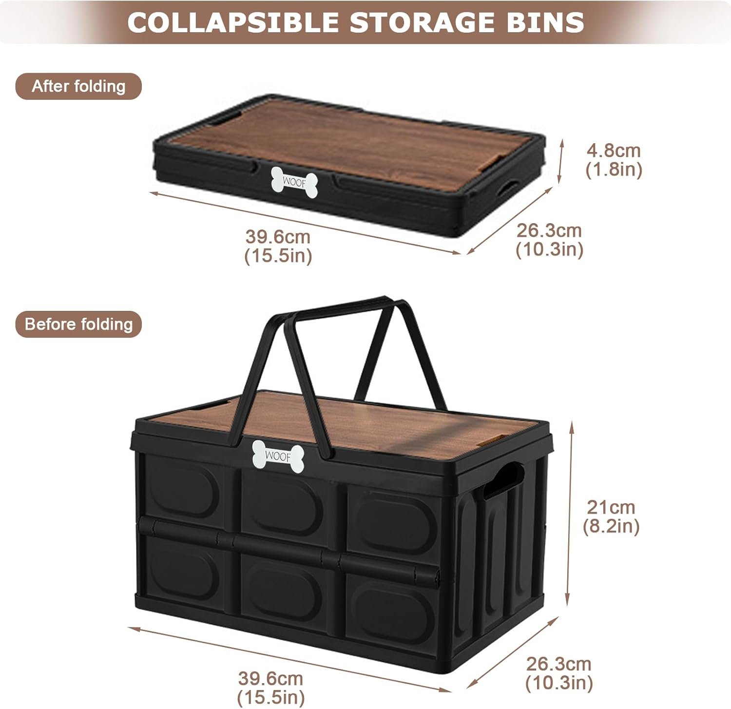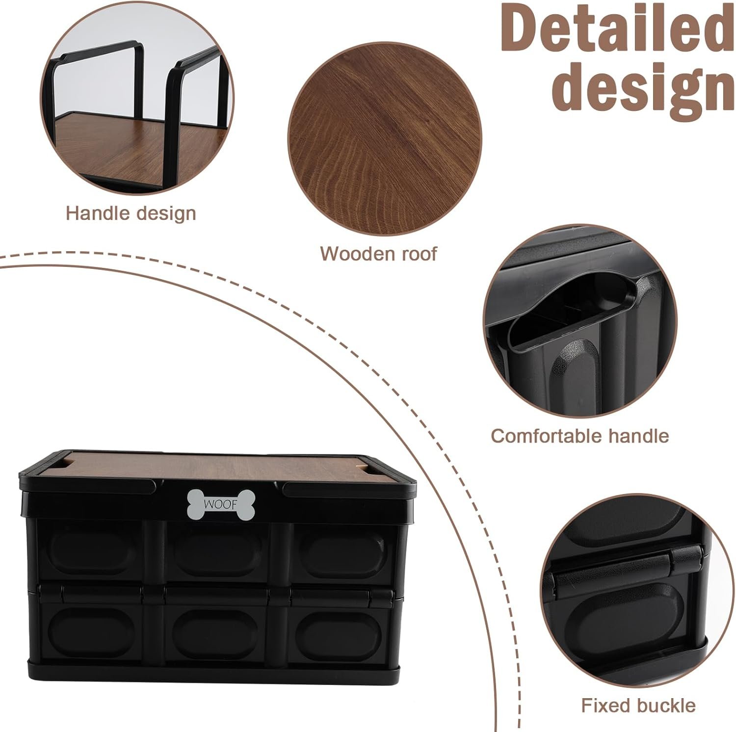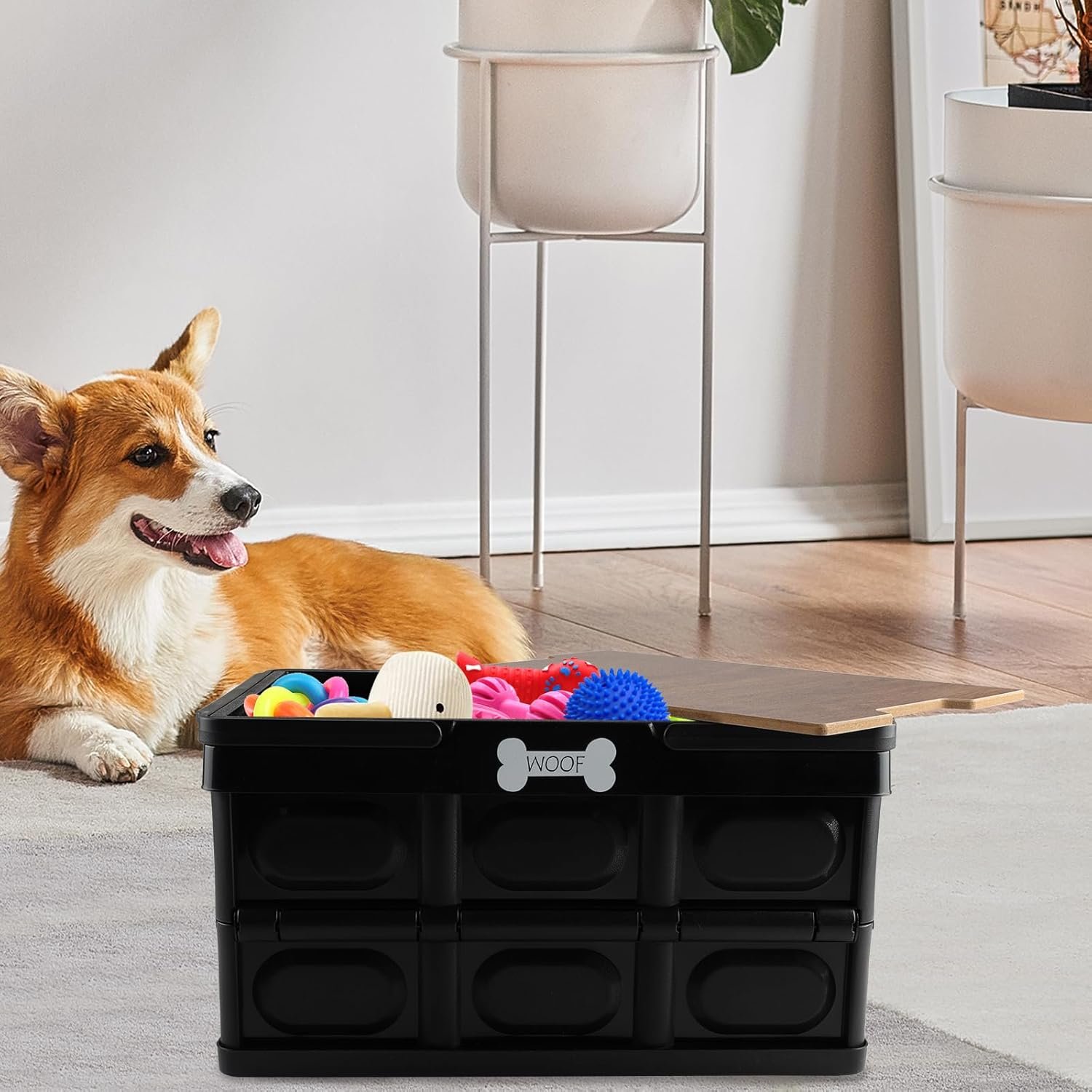 Outdoor Dog Toy Bin wtih Handles,Collapsible Dog Stuff Organizer Portable,Pet Storage Basket with Wood Cover for Dog Toys/Snack/Camping Essentials,Ideal for Car Trunk,RV Trip,Picnic-Black