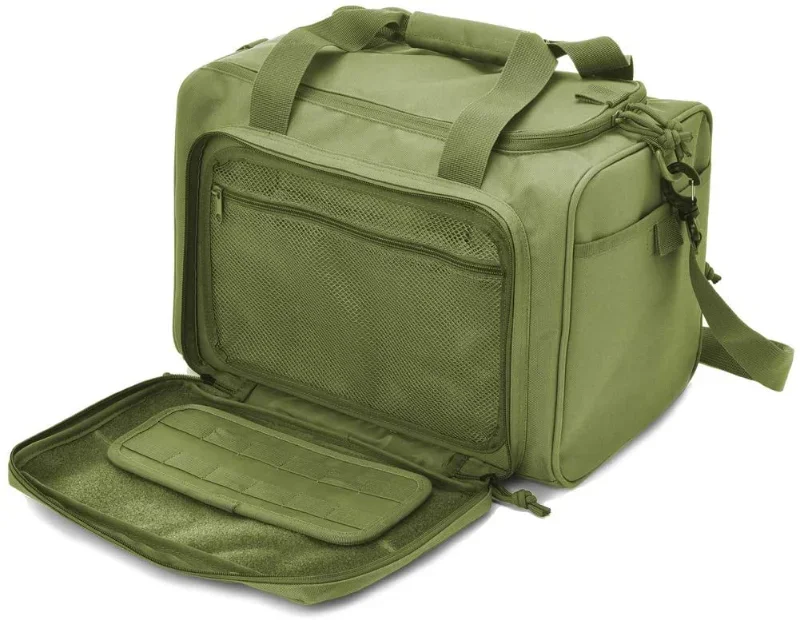 Pistol range bag main compartment with 2pcs removable inner partitions main compartment to individual as tactical range shooting bag or photography duffle