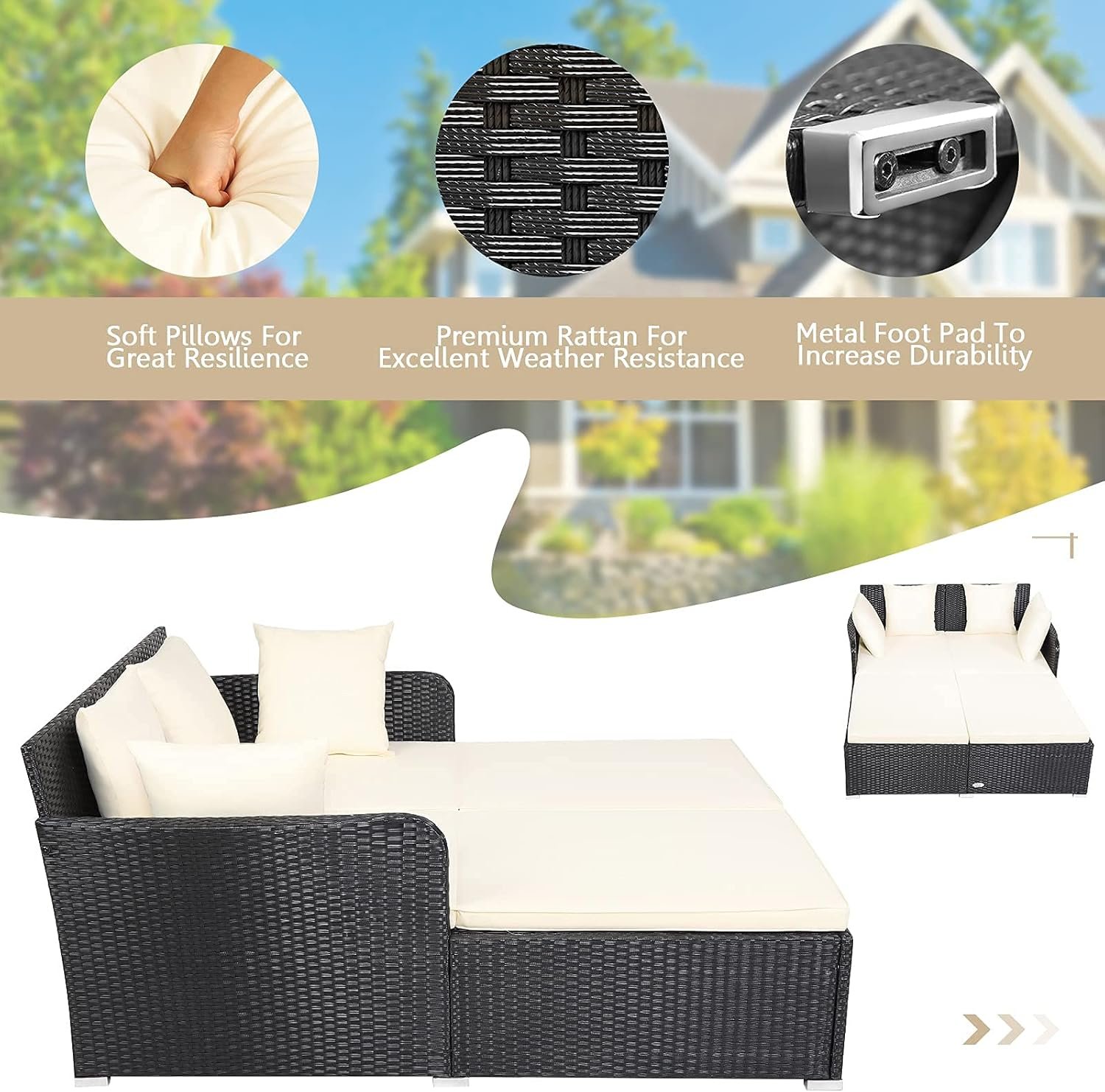 ☁️【Multiple Use】: The practical rattan daybed with stylish appearance is a perfect complement to the living room, courtyard, terrace and more. The aluminum foot pads on the bottom improve durability while carrying a maximum weight of 800 lbs.