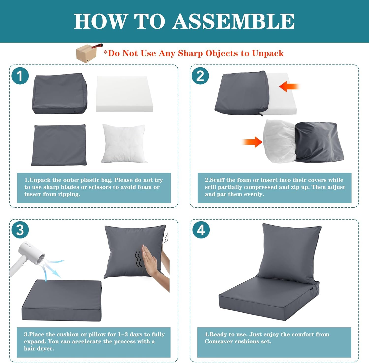 Package Information: Each package includes 4 pcs items: Two covers and two inserts. The seat cushion sponge and cover measure 24″L x 24″W x 4″H and the backrest pillow insert and cover measure 24″L x 22″W. Please follow up the attached installation guide paper and assemble them together. Please measure the seat cushion size carefully before placing an order.