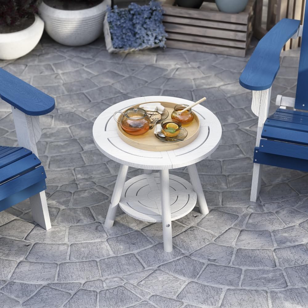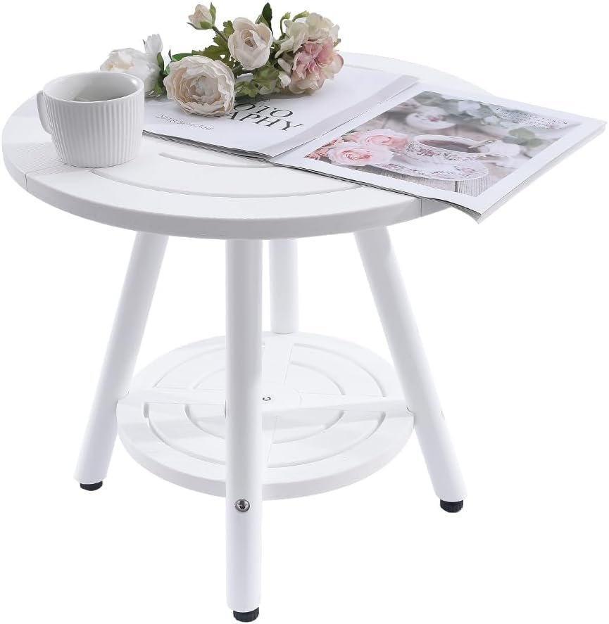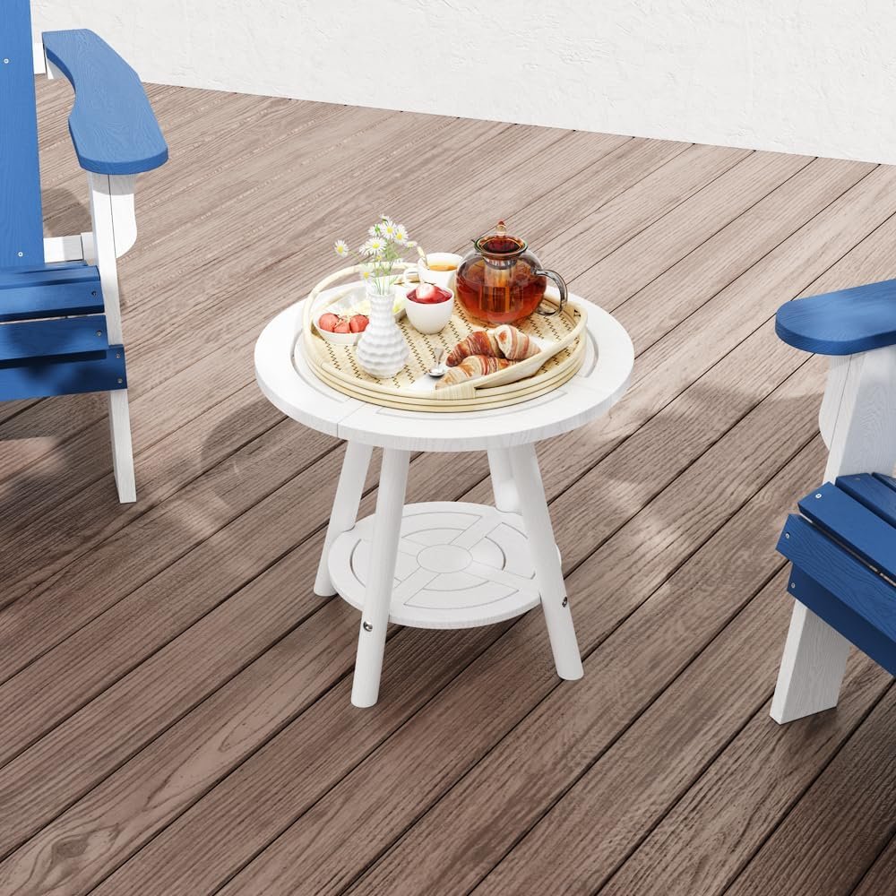 Outdoor Side Table – 2-Tier Round Plastic End Table, Weather-Resistant Patio Furniture for Deck, Garden, or Poolside (White)